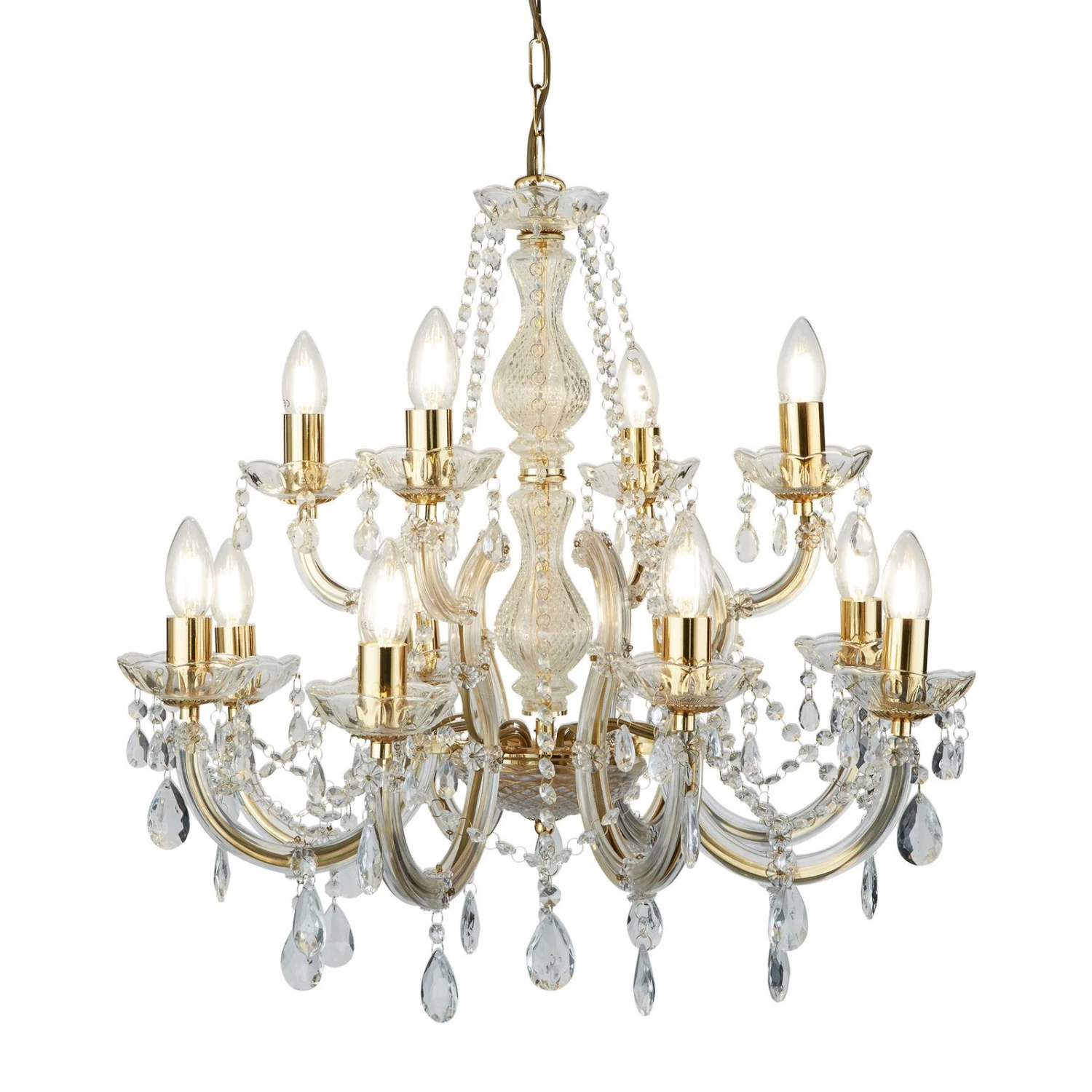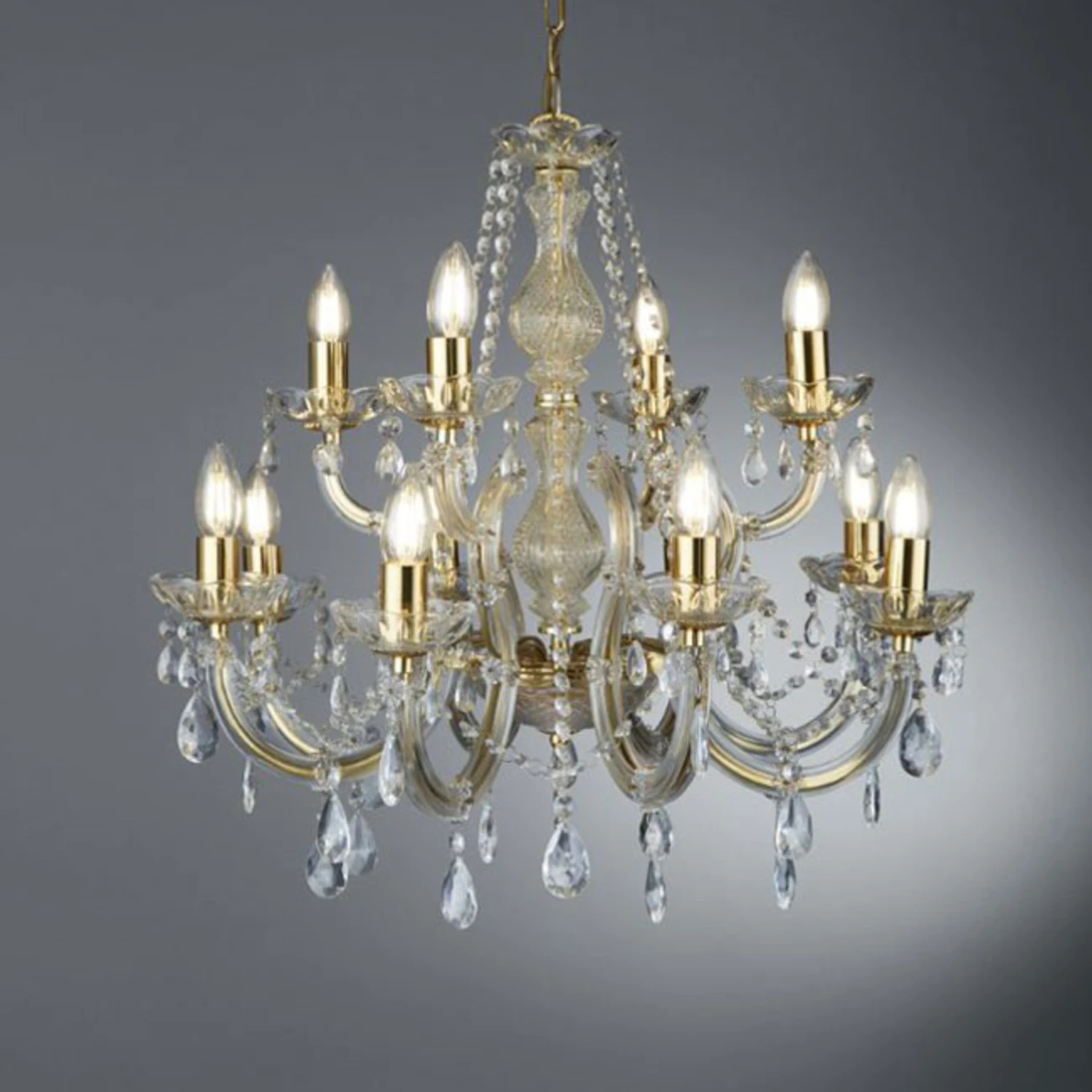 Klares Acrylglas und glänzendes Messing vereinen sich in dem Kronleuchter MARIE THERESE zu einem prunkvollen Einrichtungsobjekt, das für strahlende Momente in klassisch eingerichteten Wohnräumen sorgt. Unterstützt wird die imposante Wirkung nicht nur durch das formschön gestaltete Gestell, sondern insbesondere durch den Behang mit zahlreichen Glaskristallen. Strahlende Momente sind damit garantiert!