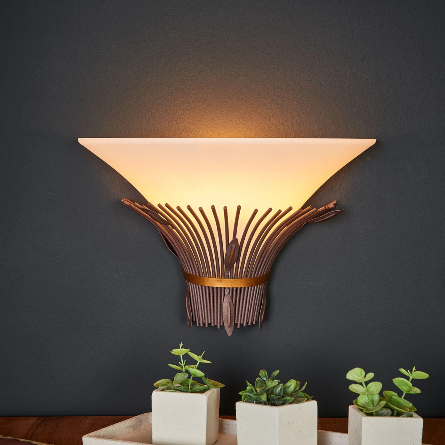 Sofort fühlt man sich an das Steppengras der afrikanischen Savanne erinnert, wenn man die Wandleuchte Canna betrachtet. Dünne, bronzierte Metallstäbe ranken wie filigrane Grashalme an dem trichterförmigen Glasschirm empor und verbergen die Lichtquelle des Leuchtmittels. So wirkt es, als ginge gerade die afrikanische Sonne am Horizont unter. Für jeden Afrika-Liebhaber ist Canna die ideale Leuchte, um für gemütliches Licht zu sorgen, das sofort das Fernweh weckt. In die E14-Fassung der Leuchte können Glühlampen bis 40 W oder Energiespar- und LED-Lampen eingesetzt werden.