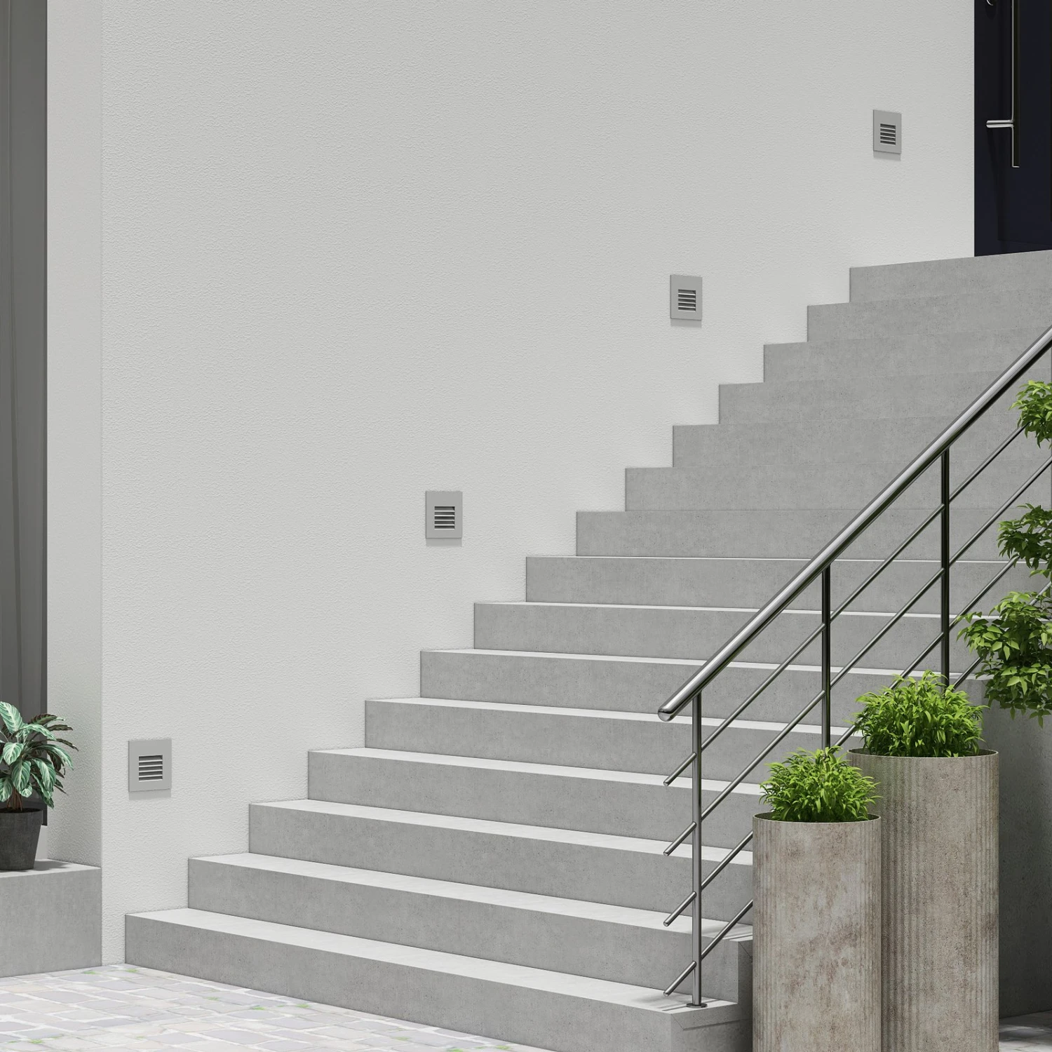Makio besteht aus Aluminium und ist in einem schlichten Silber gehalten. Ihr Leuchtenkörper verschwindet in der Wand und nur ein viereckiges, kompaktes Element bleibt zurück. Dieses ist mit Lamellen ausgestattet, die das generierte Licht angenehm abblenden. Die Wandeinbaulampe Makio kann mit entsprechenden Leuchtmitteln bestückt werden und lässt die Wahl nach Lichtfarbe frei, sodass diese an die persönlichen Bedürfnisse angepasst werden kann. Sie eignet sich hervorragend für die Beleuchtung eines Treppenaufganges. Die Schutzart IP65 macht die Einbauleuchte geschützt gegen Staub und Strahlwasser, sodass sie auch im Außenbereich verwendet werden kann.