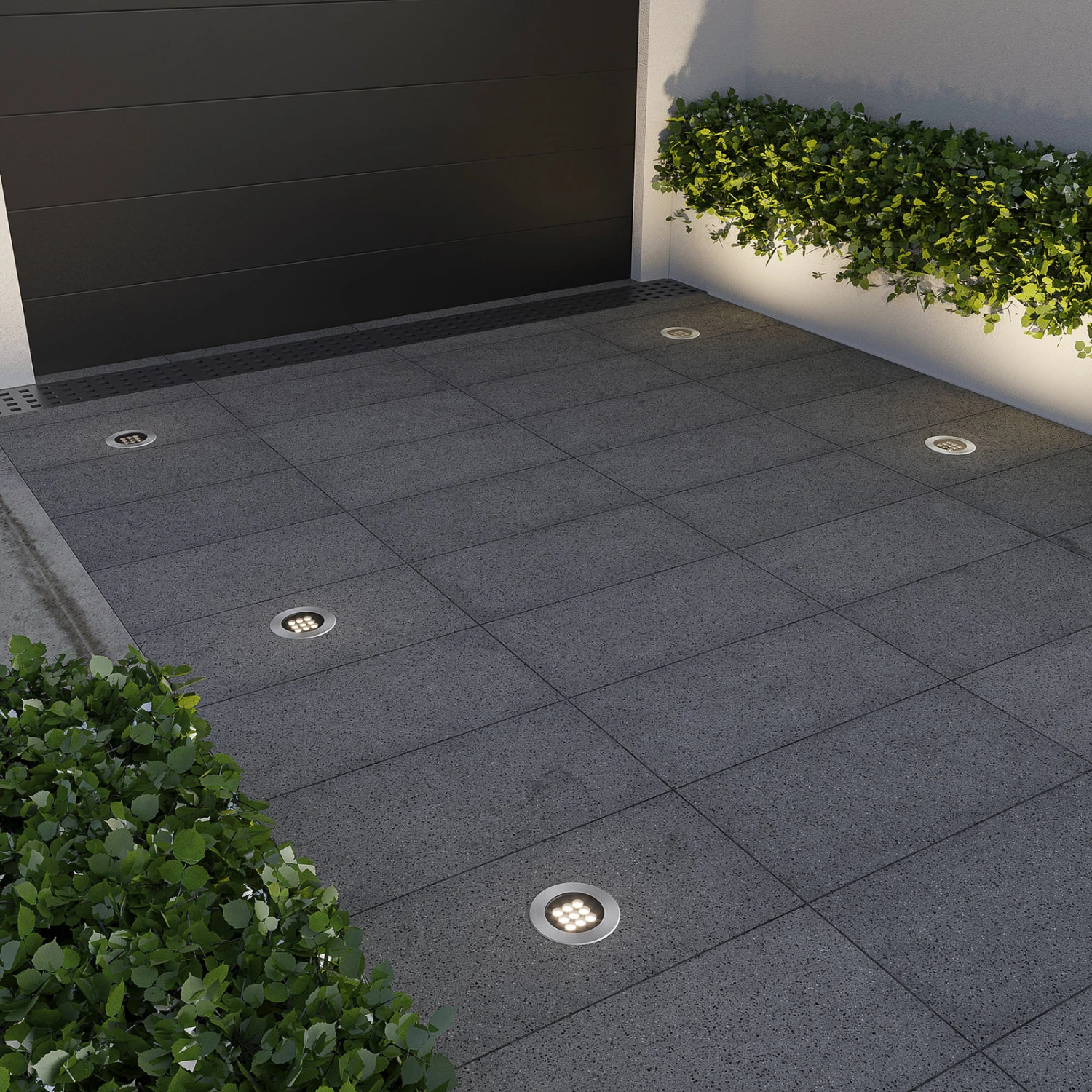Runde LED-Bodeneinbauleuchte Viorel aus Edelstahl und Aluminium Viorel ist die perfekte Begleiterin für die Beleuchtung einer Einfahrt. Die LED-Bodeneinbauleuchte besteht aus langelebigem Edelstahl, Aluminium und Glas. Bei der Installation verschwindet sie fast ganz im Boden, bis auf ein rundes, silbergraues Element, das an der Oberfläche sichtbar ist. In der Mitte des Leuchtenkörpers sind LEDs fest verbaut, die eine warmweiße Beleuchtung und ein stimmiges Ambiente für den Außenbereich generieren. Kombiniert man Viorel mit anderen Leuchten ihrer Serie, kann man einen stimmigen Gesamteindruck schaffen. – Die Leuchte ist bis zu 5.000 kg befahrbar – Oberflächentemperatur max 53°C
