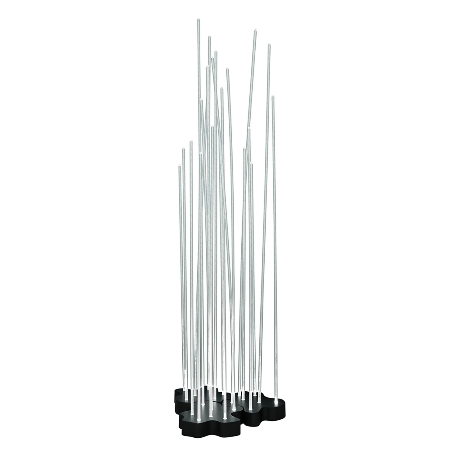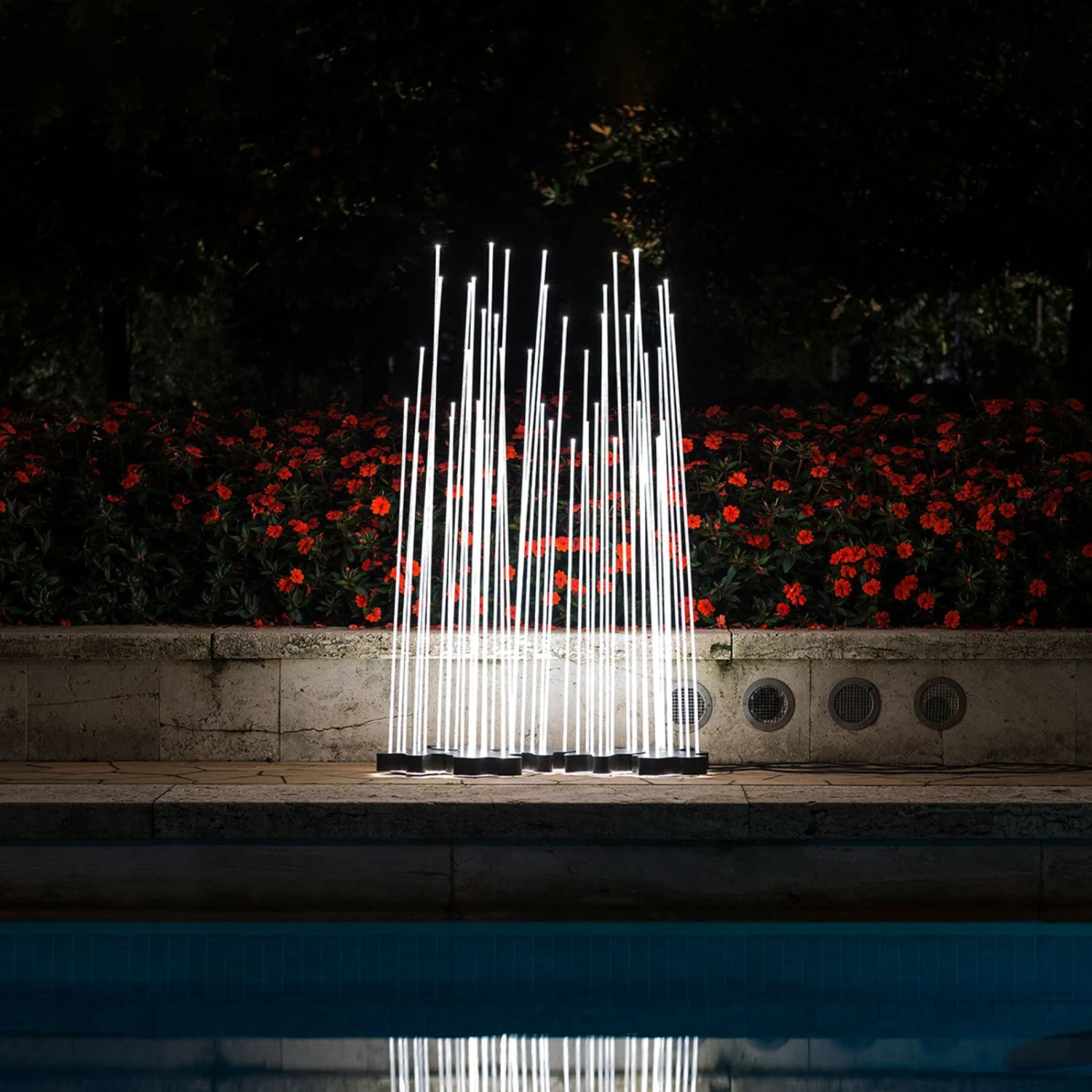 Reeds besteht aus unterschiedlich hohen Leuchtstäben aus Kunststoff, die mit monochromatischen LEDs bestückt sind und das warmweiße Licht rundherum abstrahlen. Ein Teil des Lichts strahlt um das Bodenelement herum auf den Boden. Optisch wirkt die ungewöhnliche Außenleuchte, die durch die mosaikförmigen Bodenelemente mit weiteren Komponenten verbunden werden kann, wie Schilfhalme. Eine passende Assoziation für eine Leuchte, die das Grundstück derart bereichert.