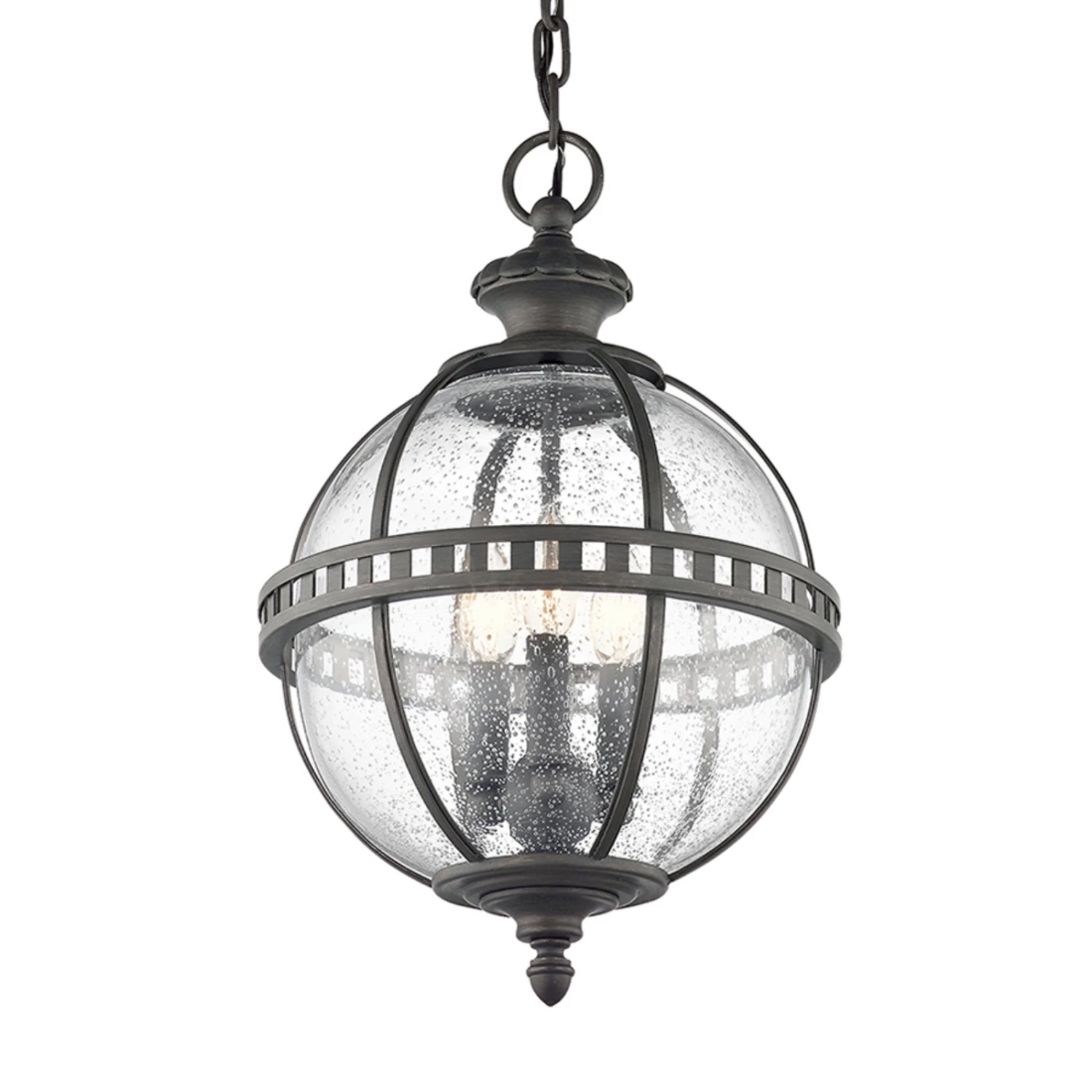 Im Design der Hängeleuchte Halleron spiegelt sich das viktorianische Zeitalter wider. Vor allem wird dies durch die aufwendige Gestaltungsweise der einzelnen Elemente erzielt, die das Design der Leuchte prägen. Kleinere Lufteinschlüsse im kugelförmigen Glasschirm und das dunkelbraune Londonderry-Finish komplettieren das Design und sorgen für eine einmalige Optik. Aufgrund der Schutzart IP44 ist die Leuchte auch für den Gebrauch im Außenbereich geeignet.