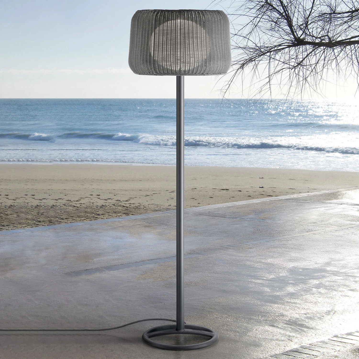 Der äußere Schirm der Stehleuchte ist handgeflochten und besteht aus einem witterungsbeständigen Kunststoff. Das Innere des Schirms wird von einem kleineren elliptischen Opalschirm aus Polyethylen, der die Leuchtmittel vor Wasser schützt, gefüllt. Der Fuß bzw. das Gestell ist schmiedeeisern und daher sehr robust und beständig. Um den Halt zu verbessern, kann die Stehleuchte – wenn sie im Außenbereich verwendet wird – von einer Halterung (nicht inklusive, im Zubehör erhältlich) ergänzt werden.