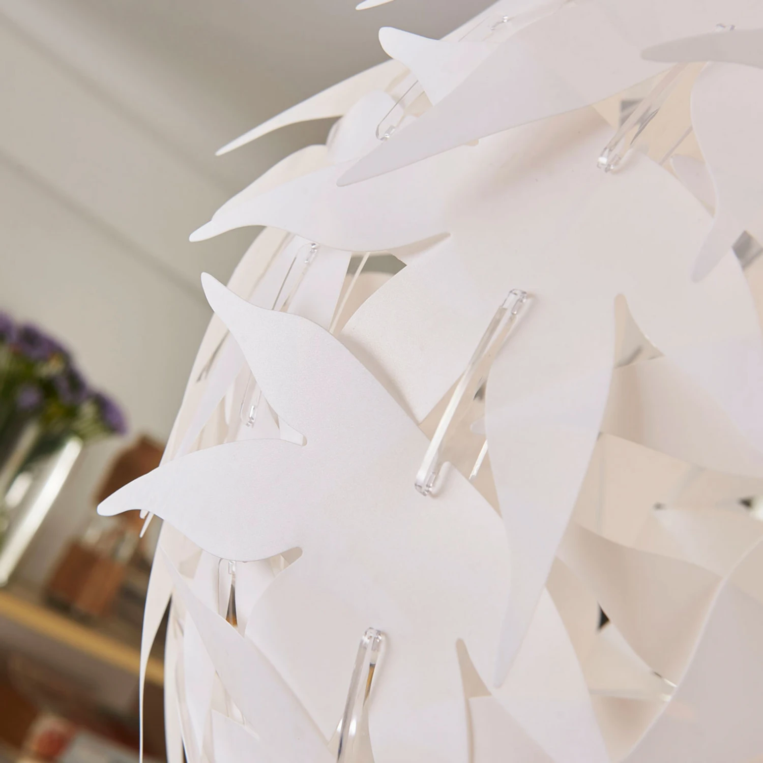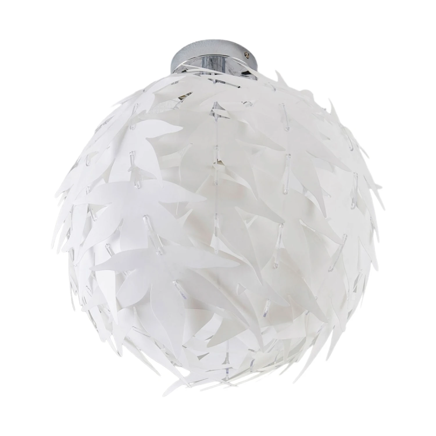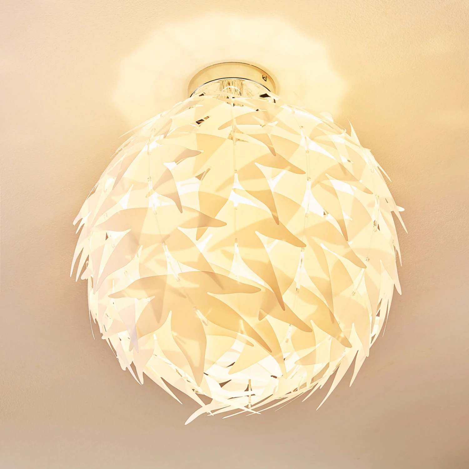 Corin ist eine Deckenleuchte die gut zu Stilen passt, die mit Jungem Wohnen umschrieben werden können oder von skandinavischer Eleganz und Schlichtheit geprägt sind. Der kugelförmige Schirm setzt sich aus vielen einzelnen Bestandteilen zusammen, die wie Blätter aussehen und gemeinsam eine unterschiedliche Lichtdurchlässigkeit ergeben, weil einzelne Elemente sich auch schon einmal überlappen. Es entsteht mit der weißen Oberfläche ein besonders gemütliches Licht, das man mit der Wahl eines warmweißen Leuchtmittels richtig in Szene setzen kann. Die Deckenleuchte passt gleichermaßen gut zu Flur, Schlafzimmer und Wohnbereich.