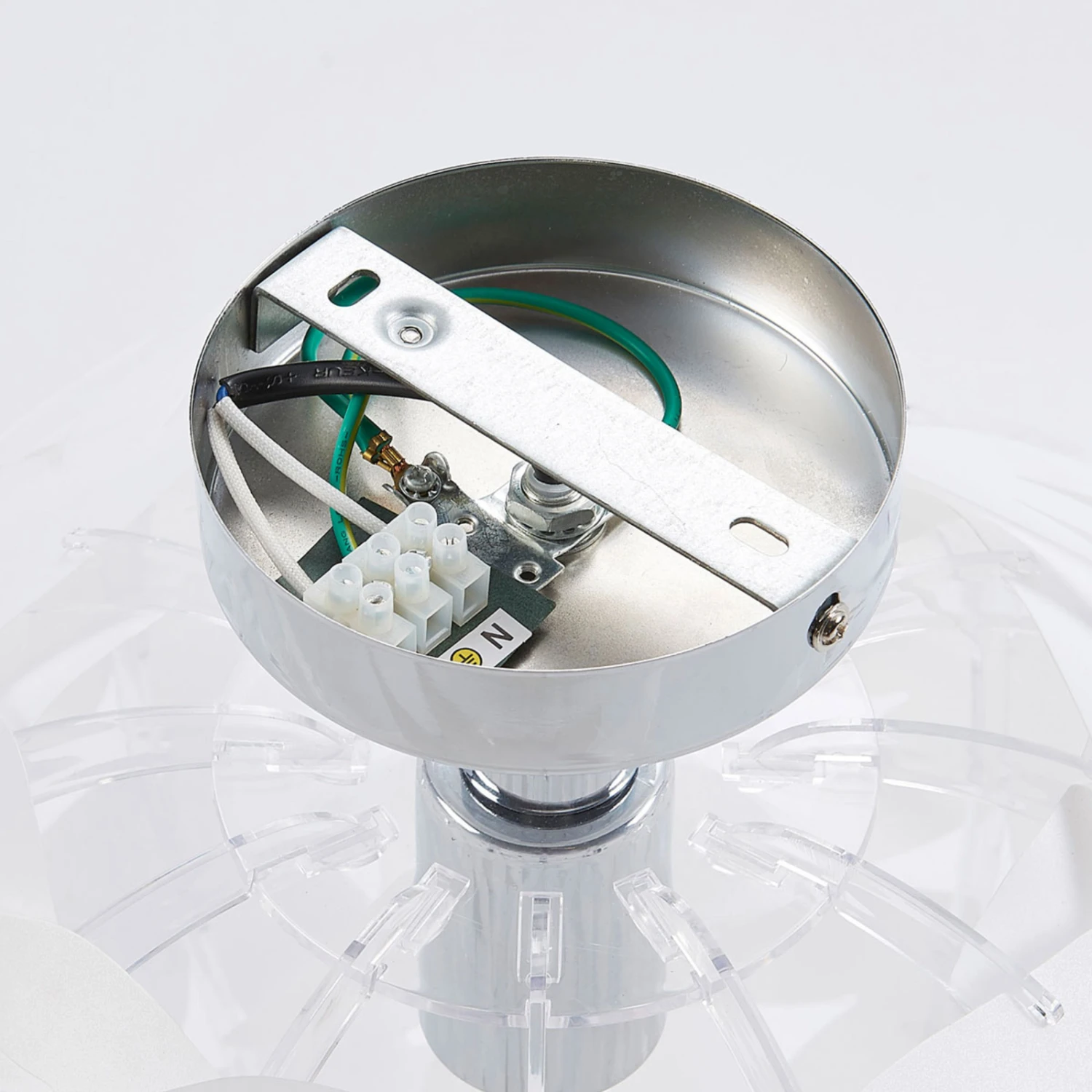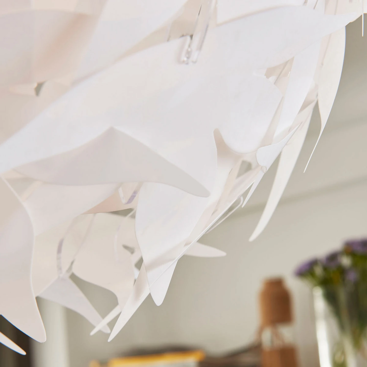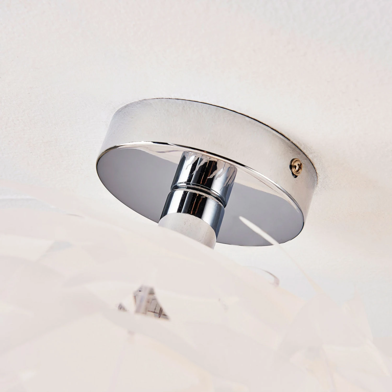 Corin ist eine Deckenleuchte die gut zu Stilen passt, die mit Jungem Wohnen umschrieben werden können oder von skandinavischer Eleganz und Schlichtheit geprägt sind. Der kugelförmige Schirm setzt sich aus vielen einzelnen Bestandteilen zusammen, die wie Blätter aussehen und gemeinsam eine unterschiedliche Lichtdurchlässigkeit ergeben, weil einzelne Elemente sich auch schon einmal überlappen. Es entsteht mit der weißen Oberfläche ein besonders gemütliches Licht, das man mit der Wahl eines warmweißen Leuchtmittels richtig in Szene setzen kann. Die Deckenleuchte passt gleichermaßen gut zu Flur, Schlafzimmer und Wohnbereich.