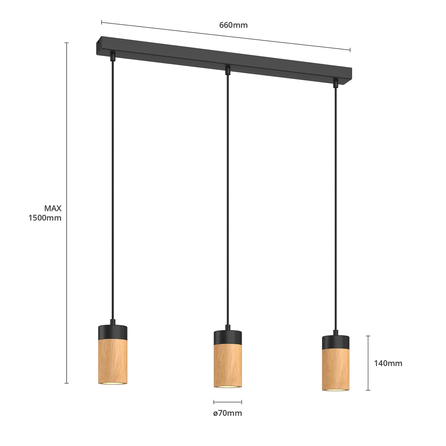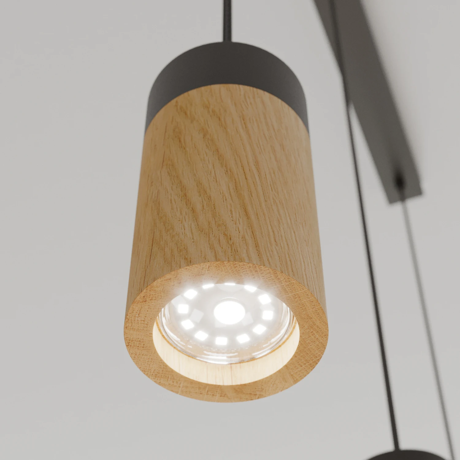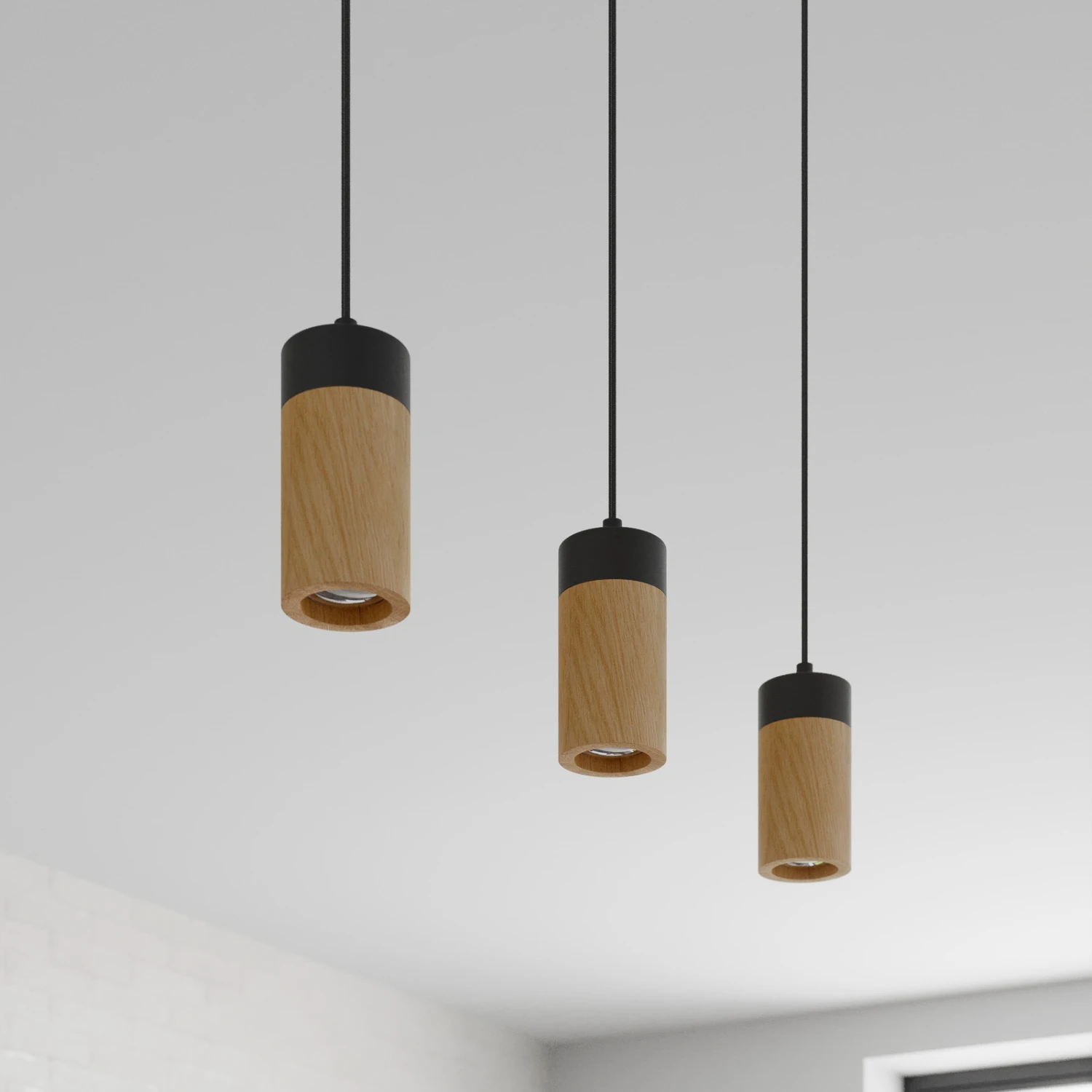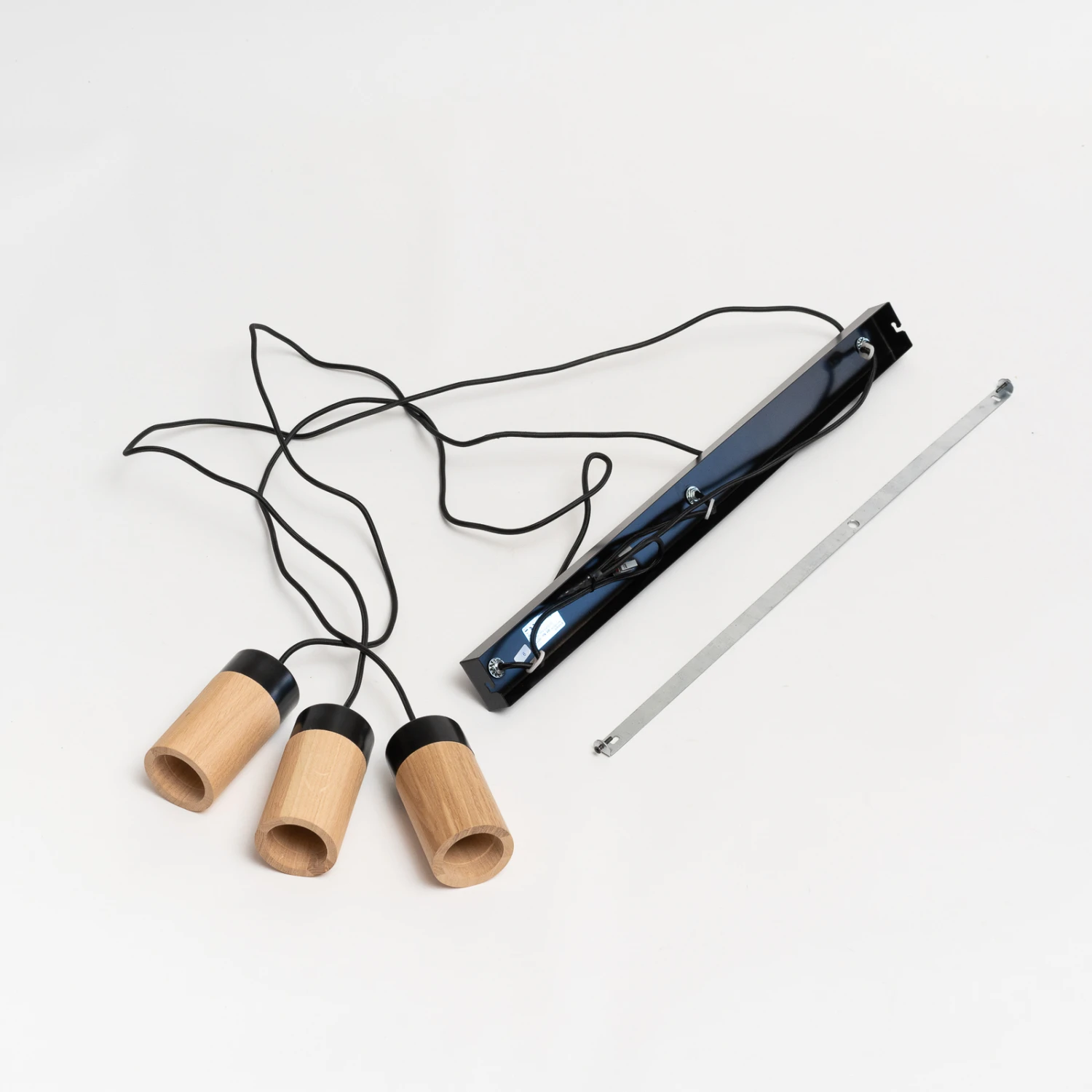 Dreiflammige Hängeleuchte Plain aus Metall und Eichenholz mit länglichem Baldachin