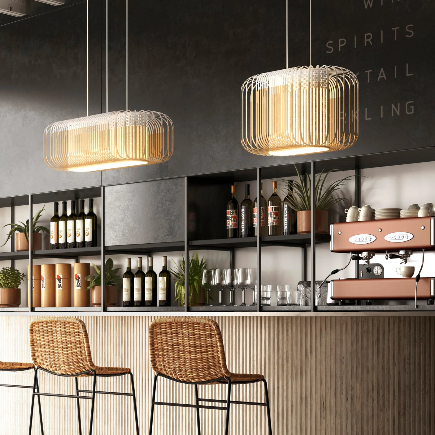Der Designer Arik Levy vereint in der Leuchtenserie Bamboo gekonnt natürliche Materialien mit modernen Designs in einem trendigen und schlichten Zen-Stil. Der oval geformte Außenschirm besteht aus einzelnen Streben aus Bambus, die für ein effektvolles Licht- und Schattenspiel in der Umgebung sorgen und wurde im oberen Bereich lackiert. Darin sitzt ein kleinerer Schirm aus geflochtenem Bambus, der das Licht der Leuchtmittel entblendet und es harmonisch abstrahlen lässt.