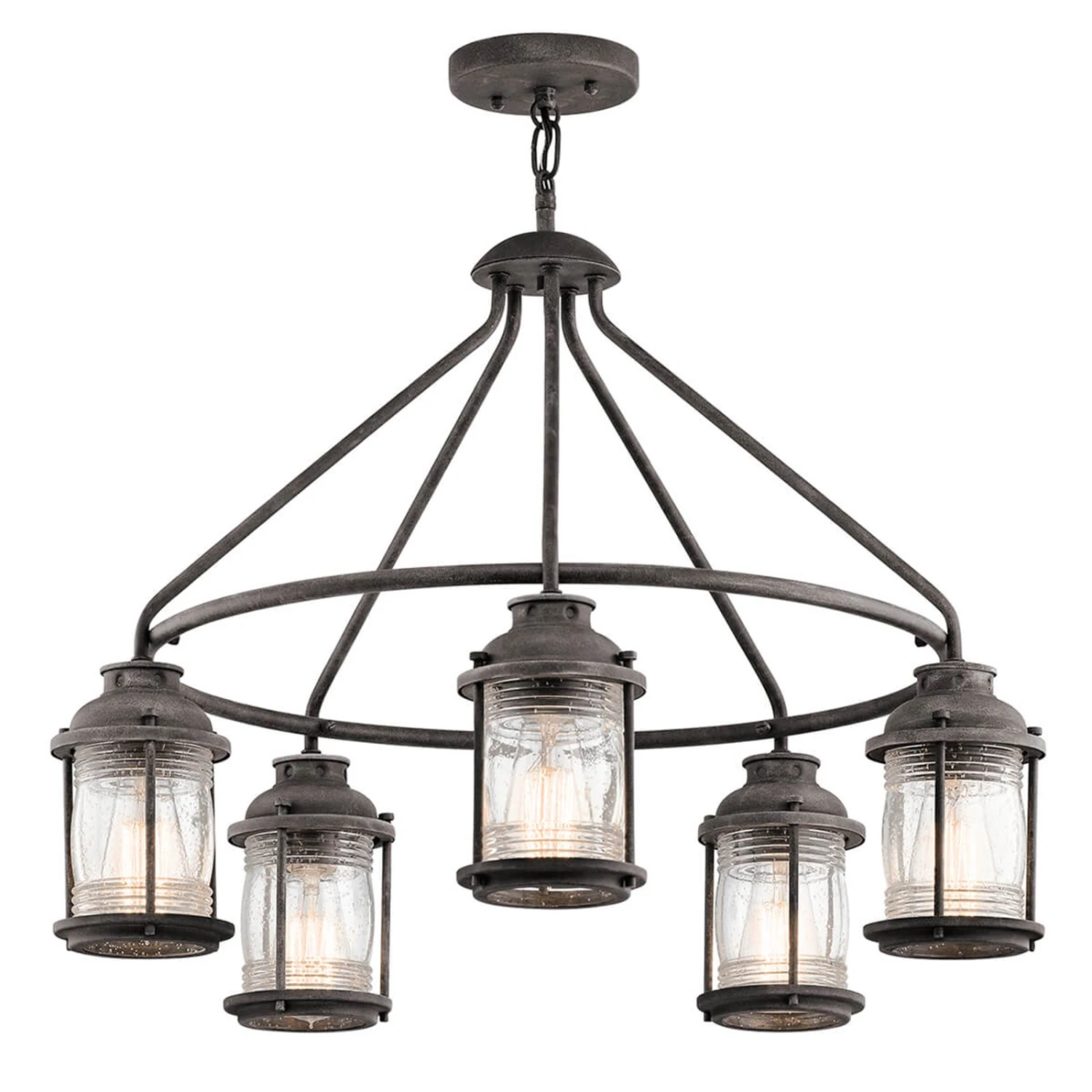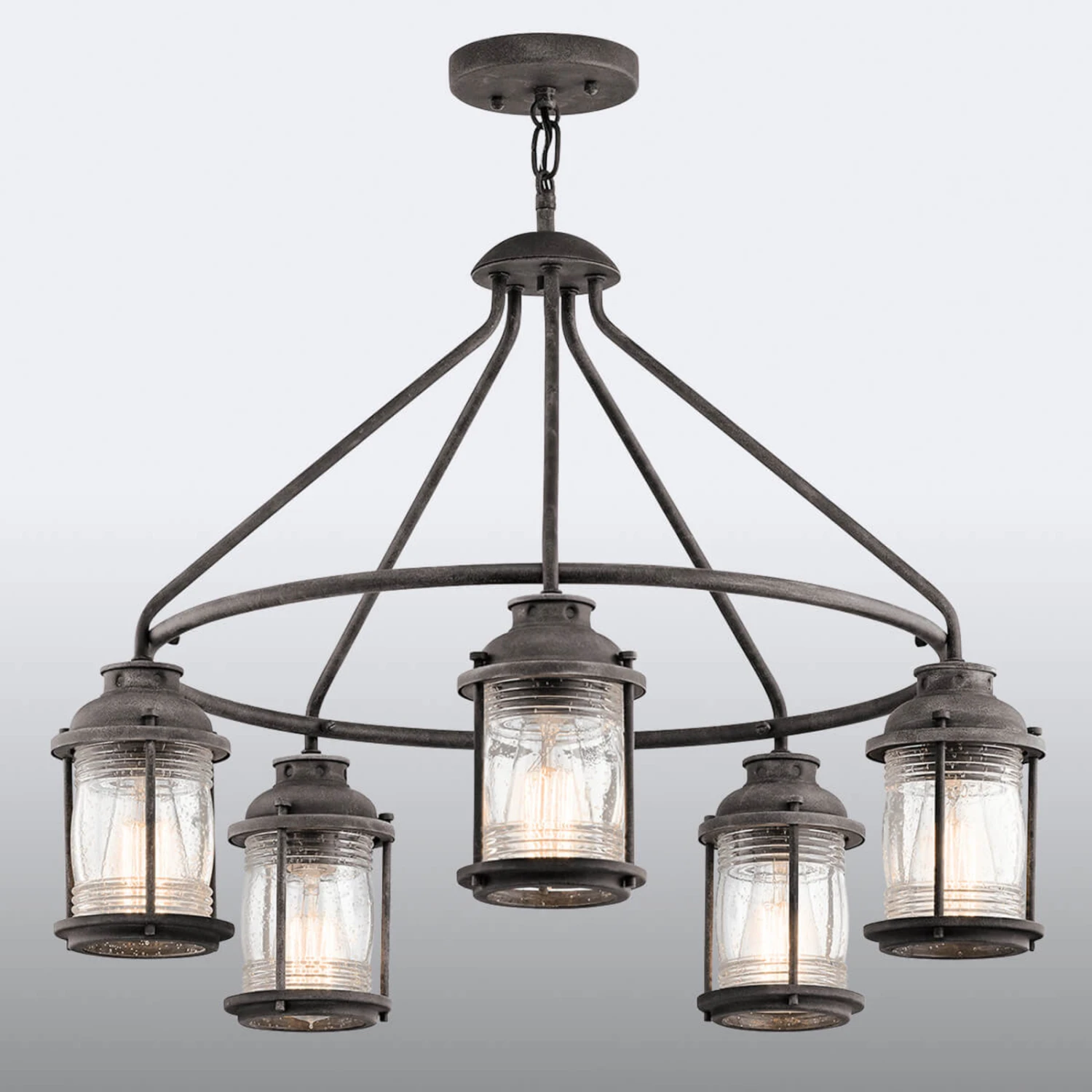 Die im verwitterten Zink-Design gearbeitete Hängelampe Ashland Bay trägt fünf laternenförmige Leuchten und strahlt in ihrer gesamten Optik einen Hauch von kolonialem Flair aus. Werden Leuchtmittel, wie z. B. Filamentlampen in Kohlefaden-Optik, eingesetzt, ist die dekorative Wirkung am effektivsten.