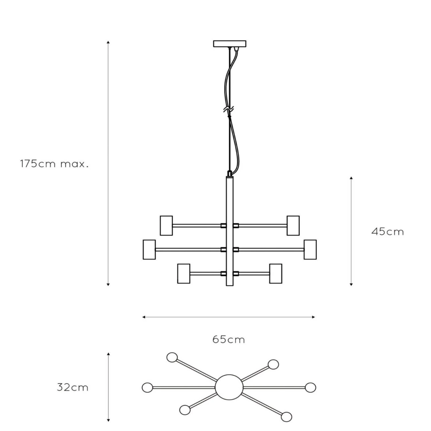 Die Hängeleuchte Leanne besteht aus einer ungewöhnlichen Metallkonstruktion und verfolgt ein interessantes Konzept. Sie hat mittig eine senkrechte, stabile Halterung mit drei horizontal ausgerichteten Armen. An den Enden der Arme sitzen jeweils zwei nach oben zeigende E27-Fassungen. Die klare und dominante Ausstrahlung macht die Pendelleuchte Leanne zu einem Blickfang.