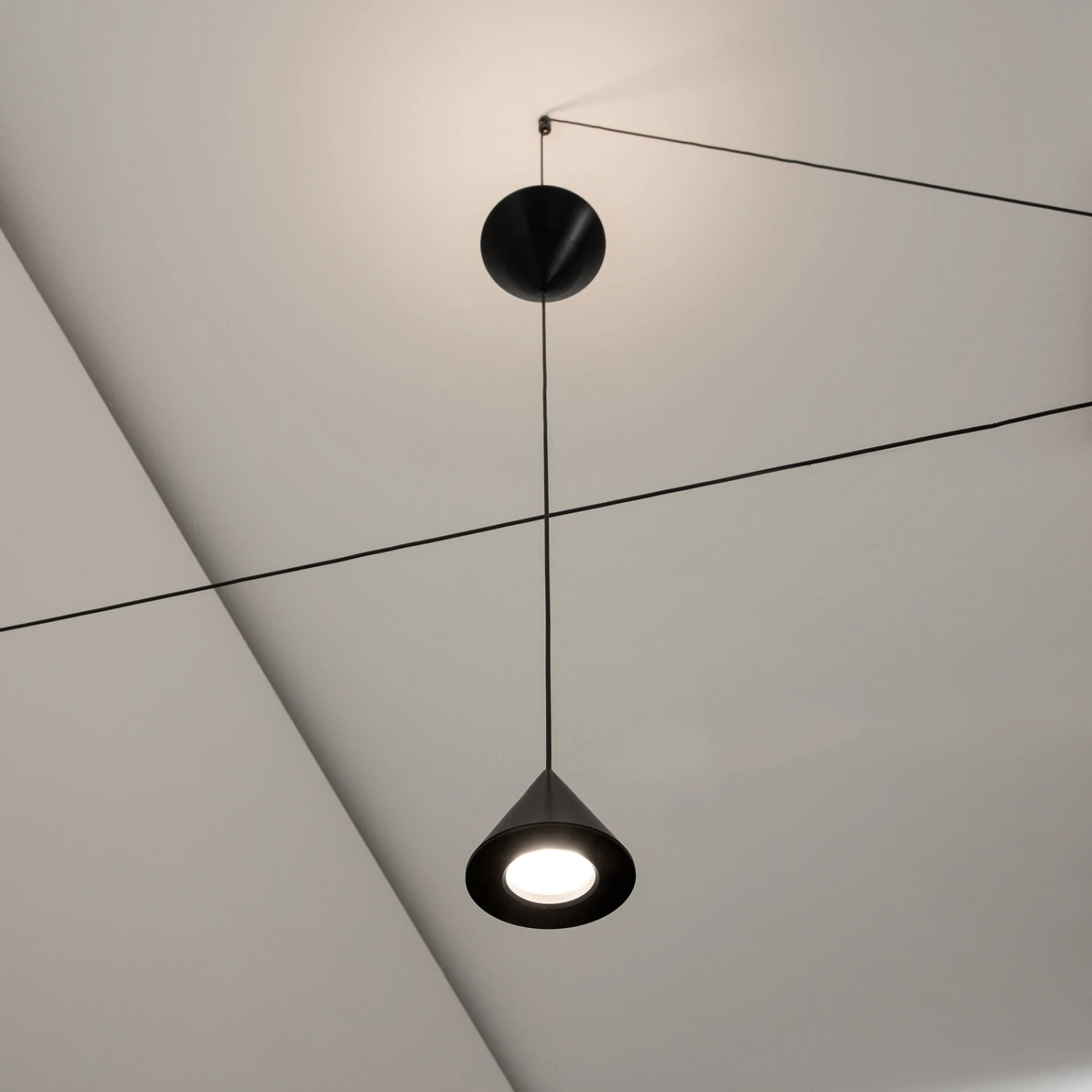 Filomena ist ganz in Schwarz gehalten und besteht aus einem Sockel, einem acht Meter langen Kabel und zwei kegelförmigen Schirmen aus Aluminium, die jeweils nach unten und oben leuchten. Bei der Anbringung sind der Kreativität keine Grenzen gesetzt. Das Kabel in gerader Linie oder im Zick-Zack, die Lampenschirme dicht unter der Decke oder lieber knapp über einer Theke – Filomena bietet individuelle Gestaltungsmöglichkeiten. Bei dem Konzept hat der Designer jedoch nicht nur die Optik bedacht. Sollte man eine Lichtquelle an einem Ort benötigen, an dem keine direkte Stromleitung zur Verfügung steht, kann Filomena so angebracht werden, dass keine unschönen Kabelkanäle montiert werden müssen. Auch beim Leuchtmittel hat man sich Gedanken gemacht. Über einen Schalter am Fuß lässt sich die Helligkeit der warmweißen LEDs in die gewünschte Intensität regulieren.