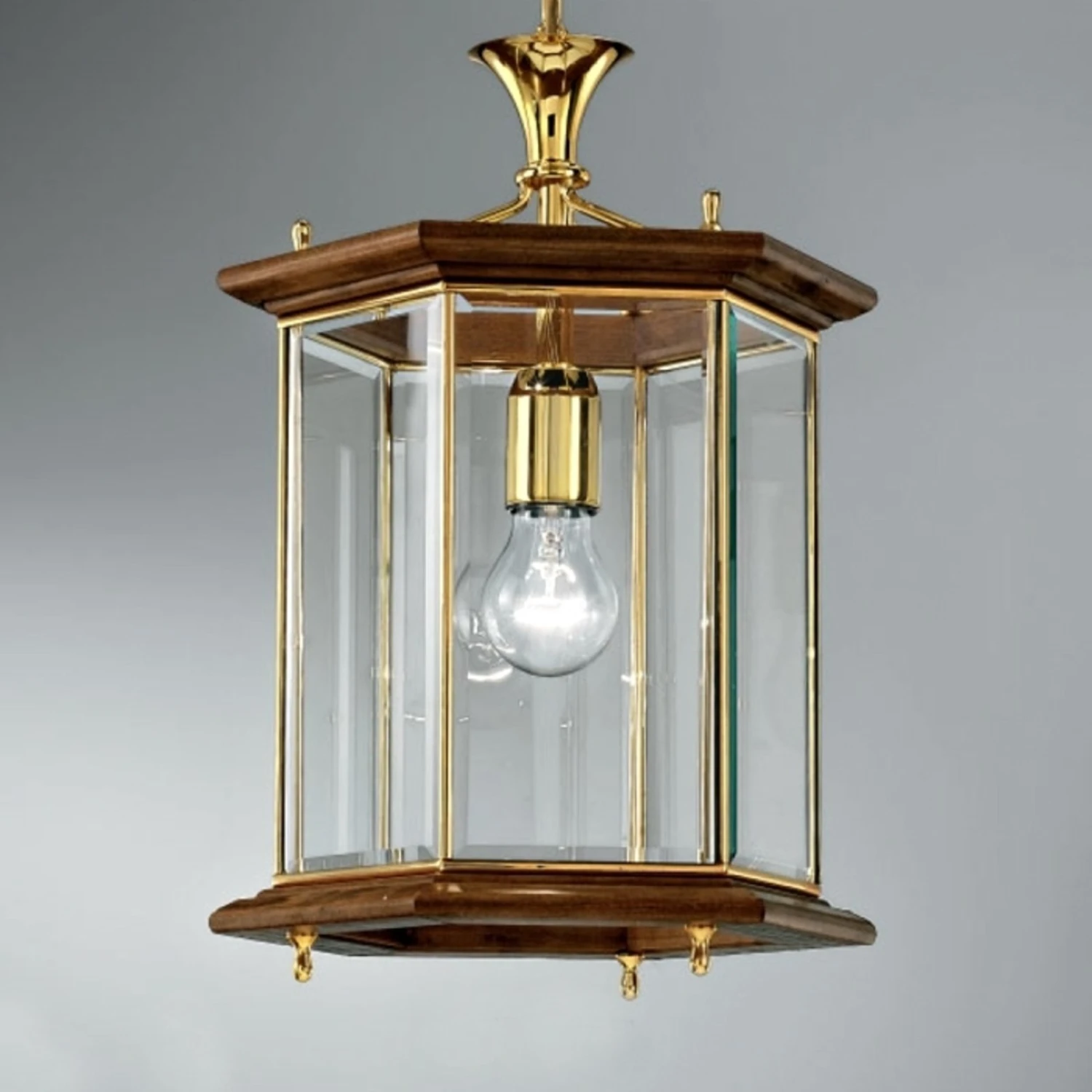 Italienische Handwerkskunst zeigt sich in der hübschen Hängeleuchte Mona. Diese wird von einer Metallkette gehalten und verbindet die Materialien Holz, Glas und Metall auf stilvolle Art und Weise. Das sechseckige Gestell mit transparenten Gläsern eröffnet den Blick auf die innenliegende Glühbirne, die von einer goldenen Fassung gehalten wird. Weitere goldene und zusätzlich hölzerne Elemente machen Mona zu der einzigartigen Leuchte, die sie ist.
