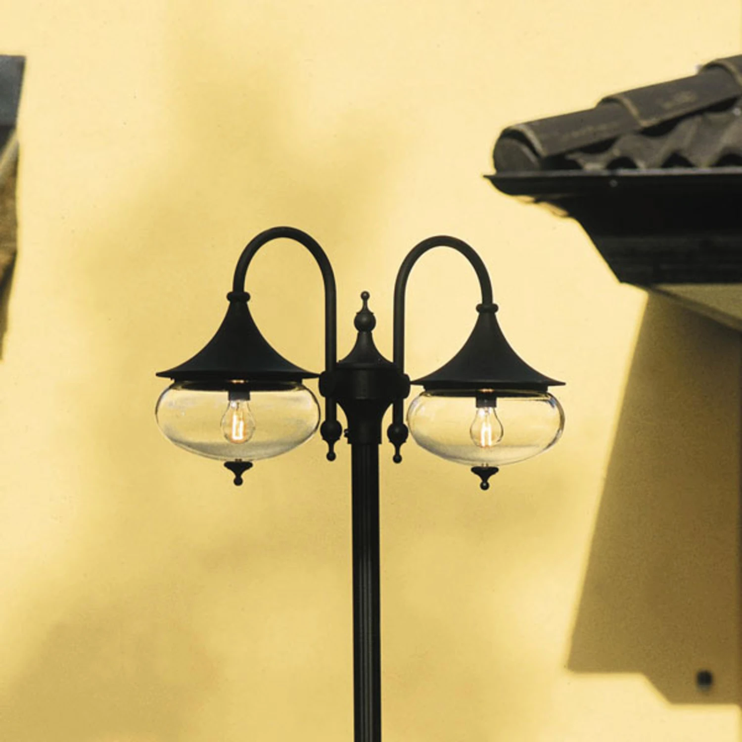 Klassische Aluminium-Mastleuchte mit 2 großen Schirmen, die beidseitig an dekorativen, gebogenen Armen hängen und durch das klare Acrylglas eine hervorragende Ausleuchtung garantieren.