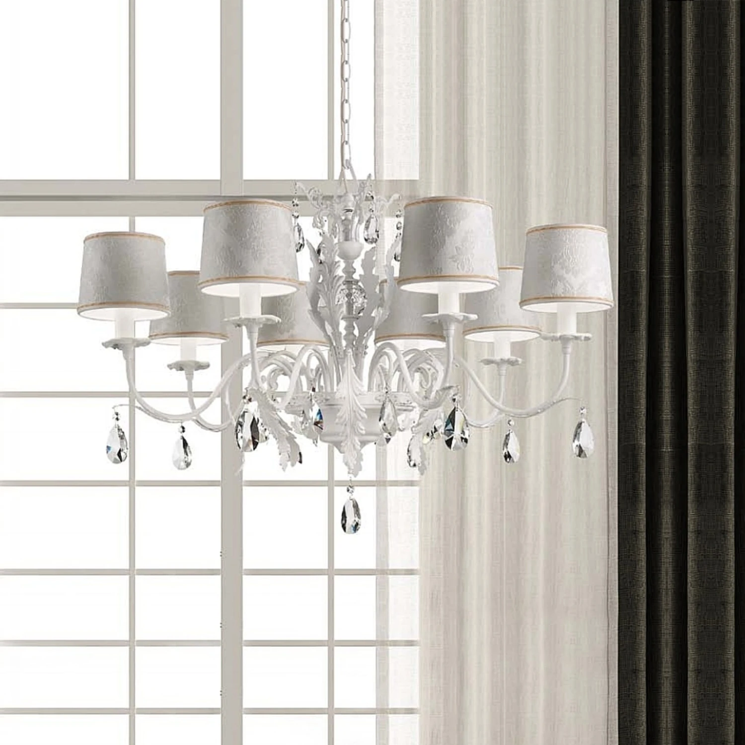 Es ist der Prunk vergangener Zeiten, der diesen stilvollen Kronleuchter schmückt. Aufwändige Verzierungen und elegant geschwungene Formen fügen sich zu einem überaus stilvollen Gesamtbild zusammen, das auch heutzutage allerlei Räumlichkeiten ziert. Der Blick richtet sich zunächst auf das pompöse Gestell mit seinen sanft gebogenen Armen, das wirkt, als wäre es von zarten Federn umgeben und so den klassisch-antiken Eindruck unterstreicht. Weiße Lampenschirme aus edlem Damast mit goldfarbener Borte sorgen dabei für angenehmes, wohnliches Licht in der Umgebung während die Asfour-Kristalle ansprechende Akzente setzen.