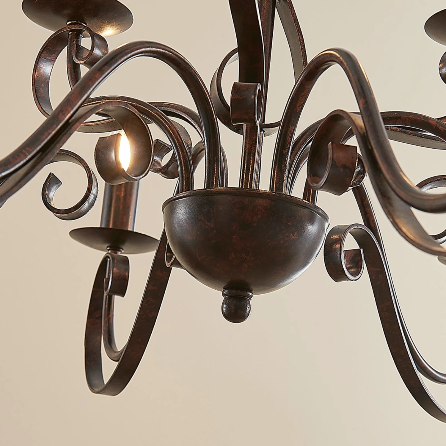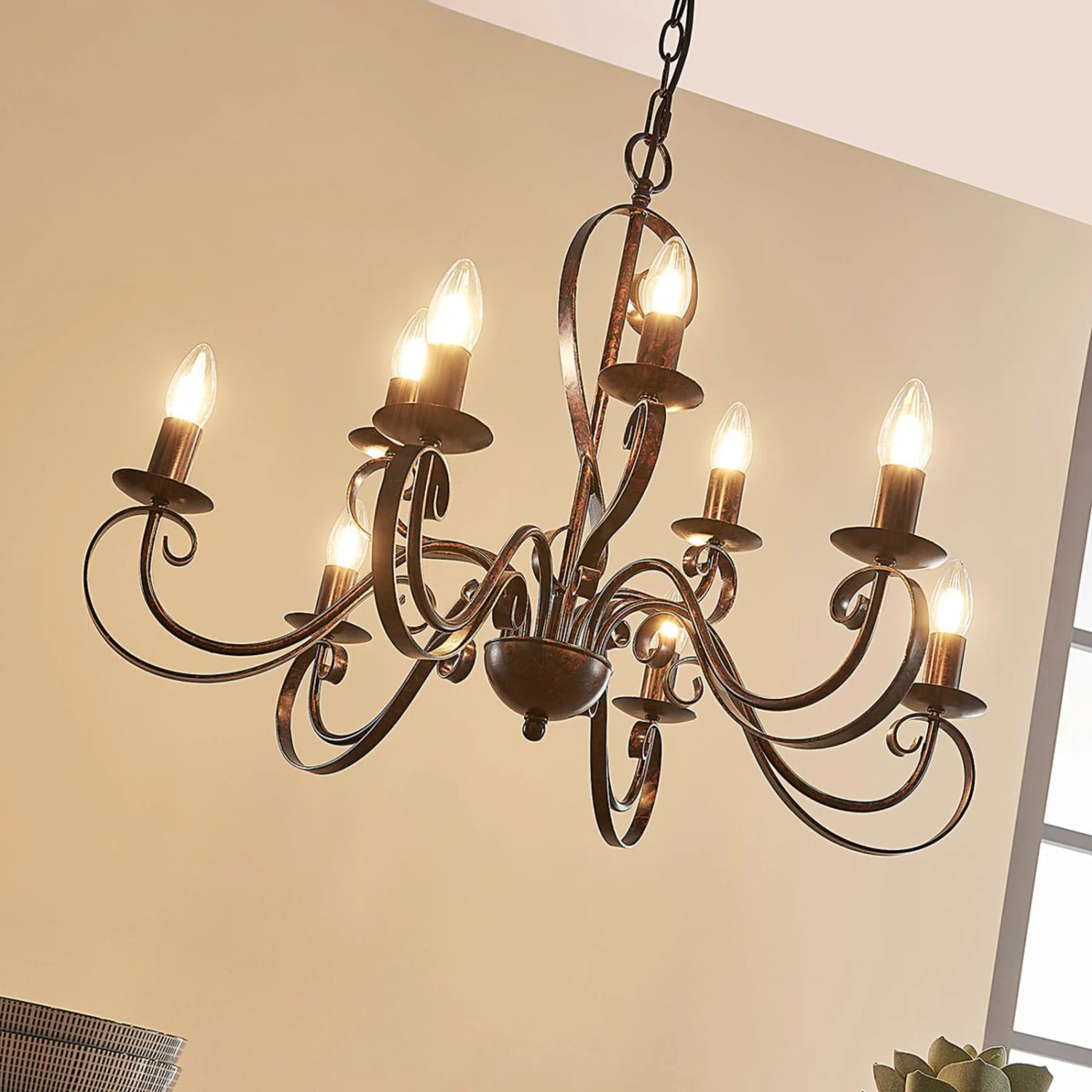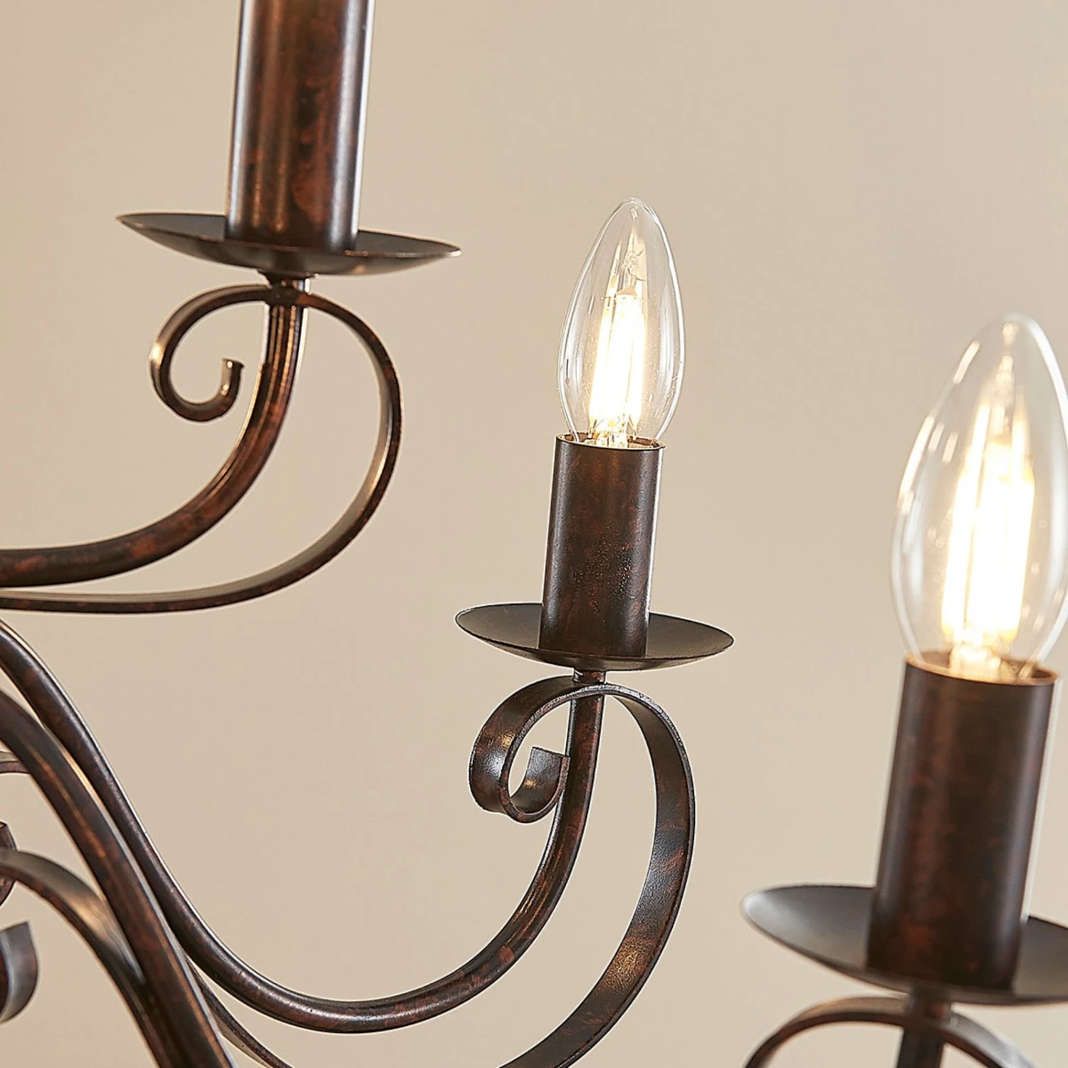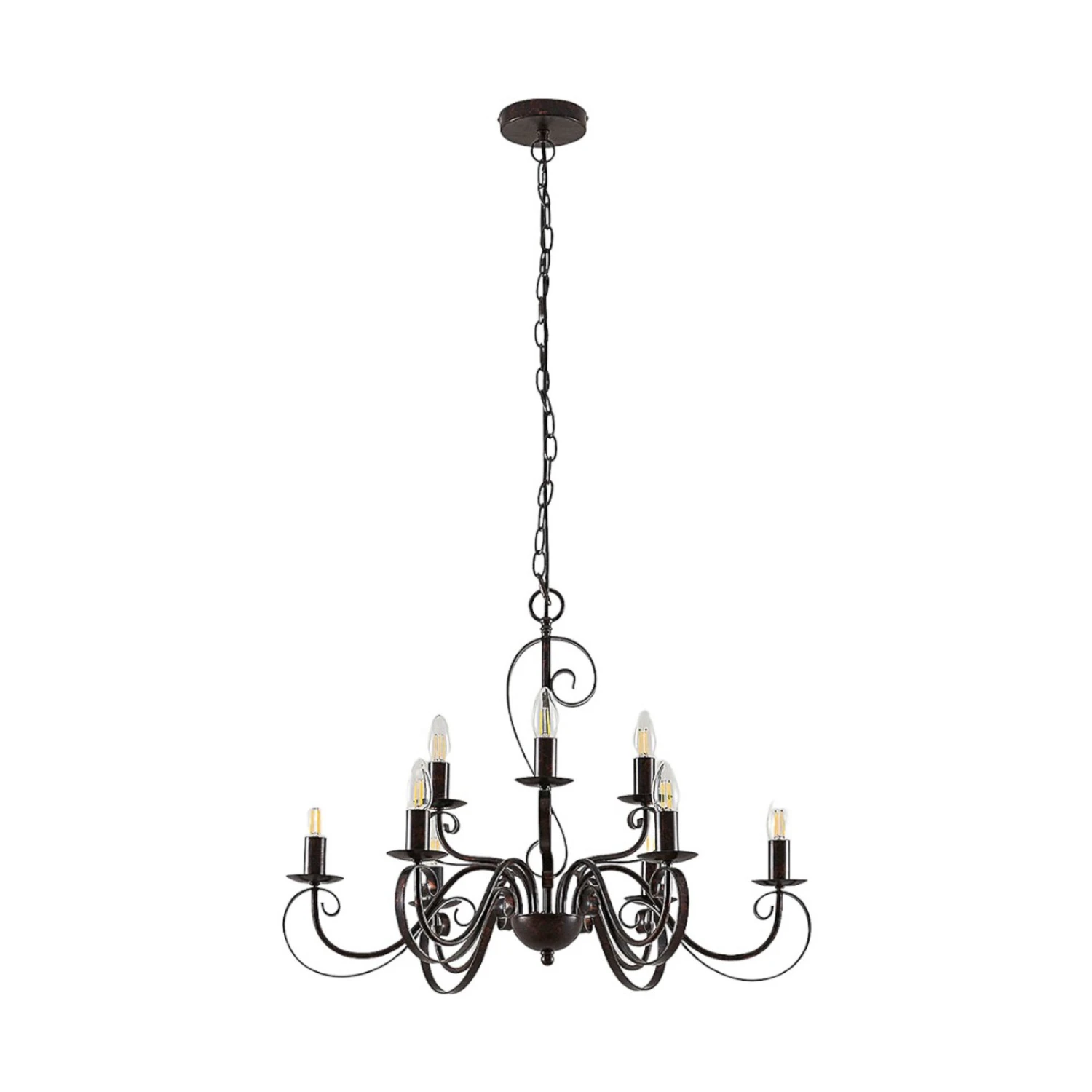 Caleb ist ein Kronleuchter, der die große Romantik in den Wohnraum bringt, denn seine Arme sind eindrucksvoll und formschön geschwungen, so dass man schon fast von einer verspielten Ausstrahlung sprechen kann. Auf insgesamt 9 Brennstellen verteilt, lassen sich E14-Lampen nach Wahl einsetzen. Auch wenn die Leuchtmittel durch den Verzicht auf Schirme sehr direkt sichtbar sind, muss man aber schon lange nicht mehr bloß auf Halogen- oder Glühlampen mit entsprechendem Sockel zurückgreifen, denn inzwischen sind auch energiesparende LED-Lampen in Kohlefadenoptik erhältlich, die der klassischen Glühlampe optisch sehr nahe kommen, so dass endlich auch in dieser Hinsicht – das Erscheinungsbild betreffend – eine brauchbare Alternative auf dem Markt ist.