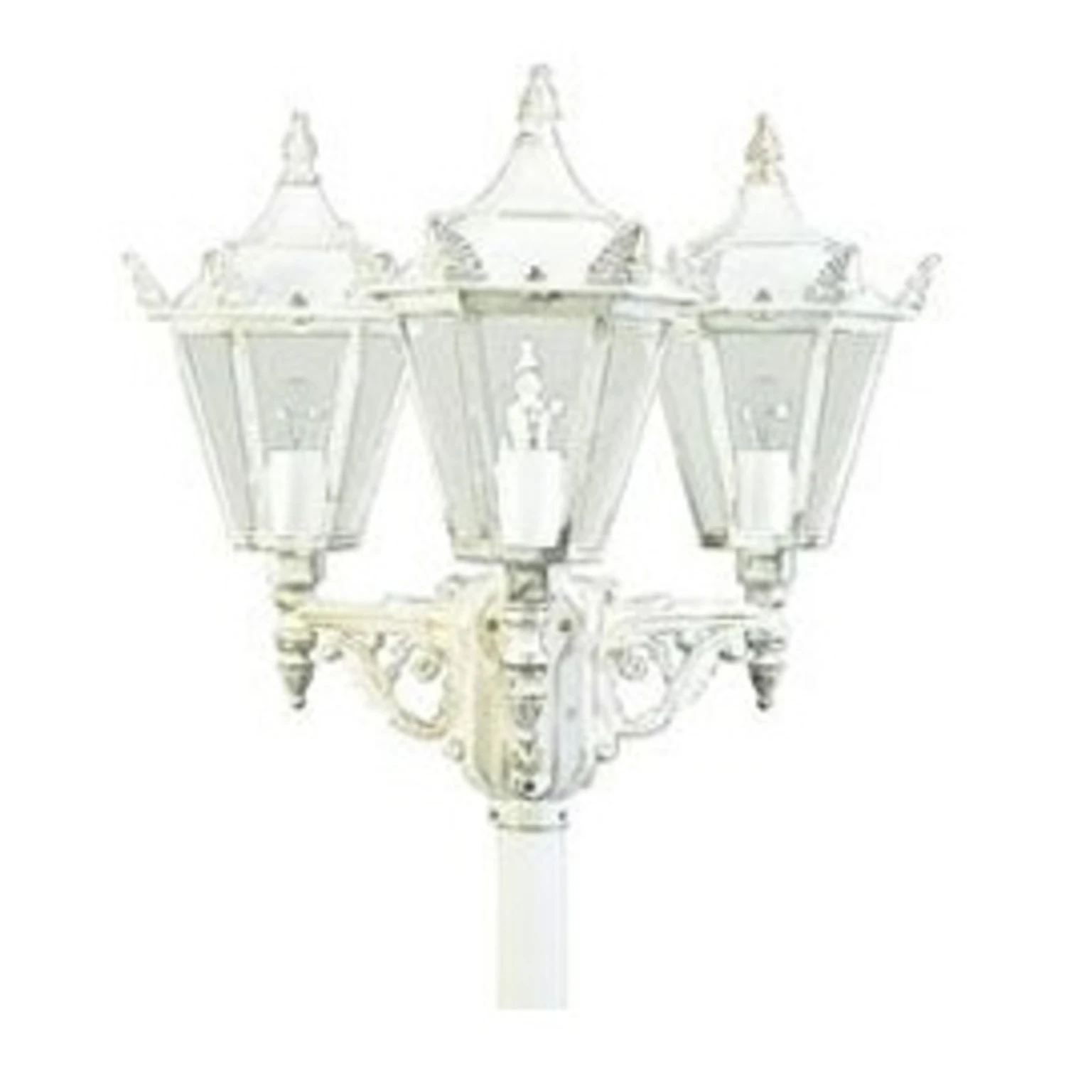 Diese mit Liebe zum Detail gefertigte Mastleuchte erzielt mit der kunstvollen Metallverzierung an Mast und Laternen eine eindrucksvolle Wirkung.