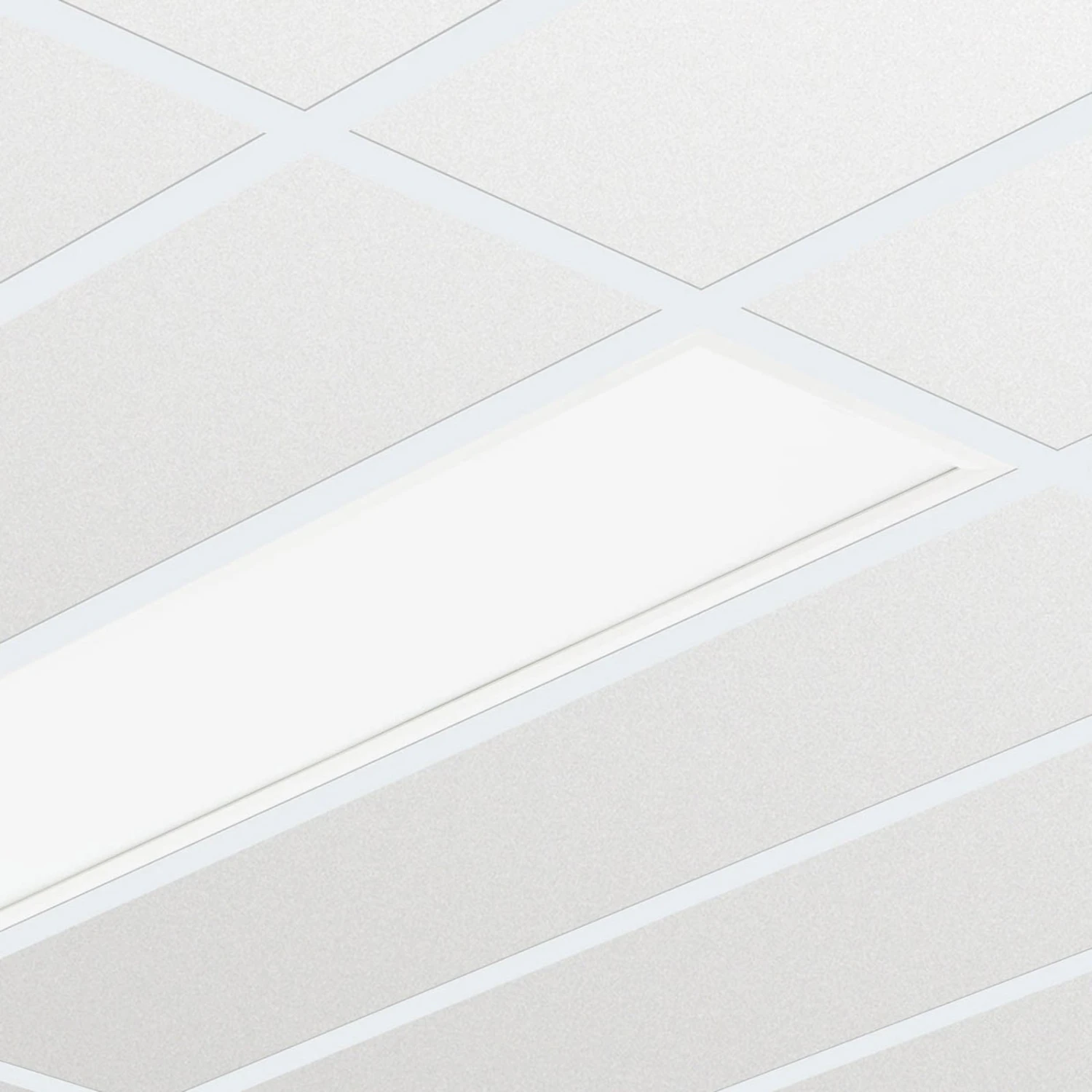 In Räumen mit Rasterdecken des Formats 120 cm x 30 cm lässt sich mit dem Einbaupanel RC132V aus der Philips CoreLine Serie eine großflächige Allgemein- und Arbeitsbeleuchtung schaffen. Dank der geringen Blendwirkung ist auch ein Einsatz über Bildschirmarbeitsplätzen möglich. Der Rahmen aus weiß lackiertem Stahl umfasst einen Diffusor aus opalem Kunststoff. Dieser streut das Licht der integrierten LEDs gleichmäßig.