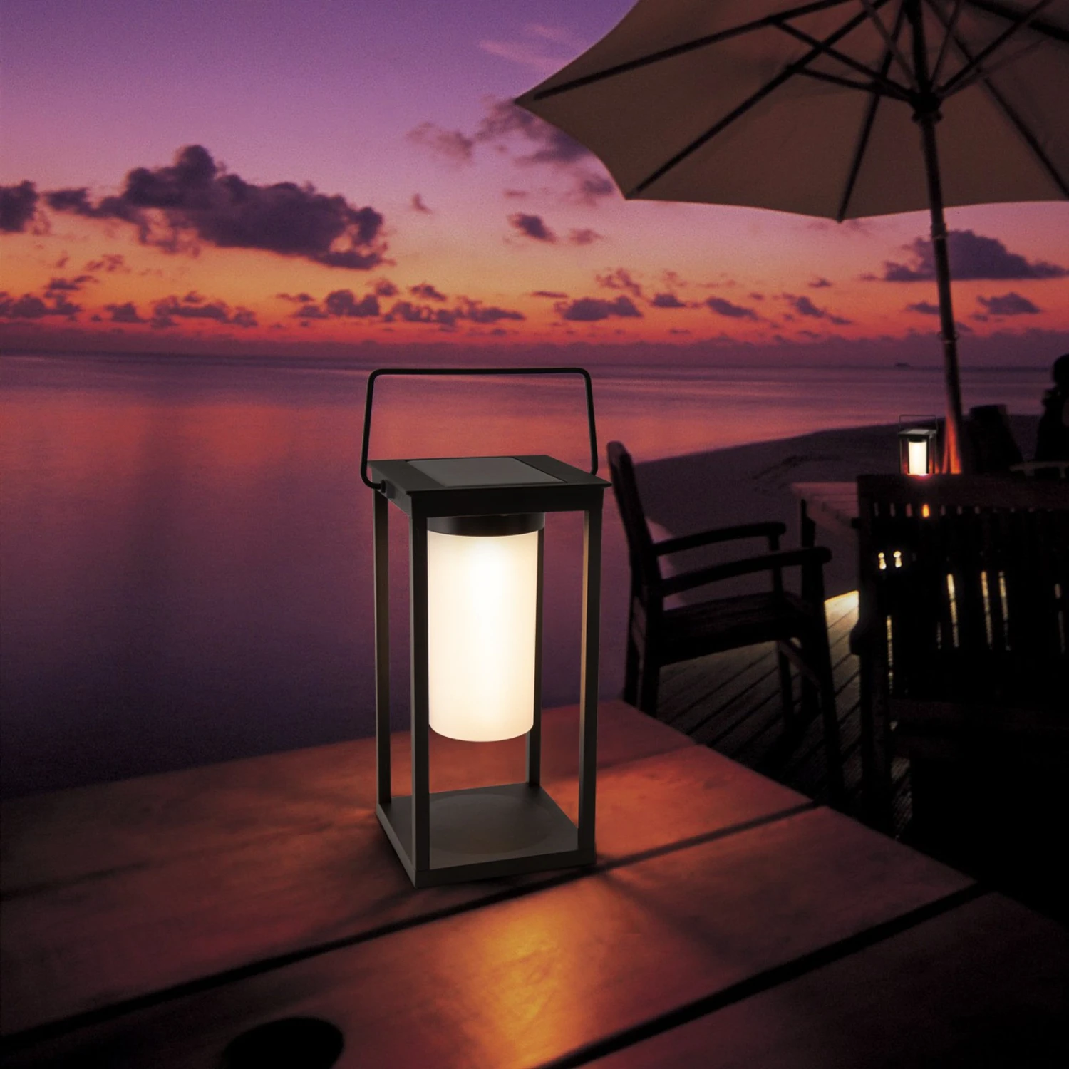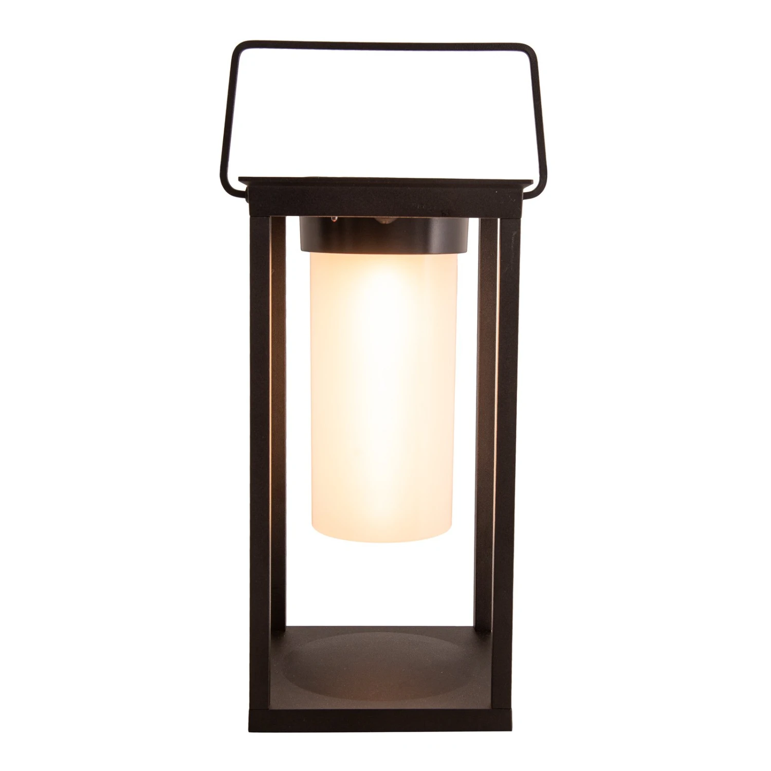 LED-Solarlaterne 3180922 mit Akku Die LED-Solarlaterne 3180922 vereint ein klassisches Design mit moderner Technik. Der integrierte Akku kann entweder per verbautem Solarmodul bei Sonnenschein geladen werden, oder alternativ über den ebenfalls vorhandenen USB-Anschluss. Sie ist darüber hinaus auch spritzwassergeschützt und eignet sich daher für den mobilen Einsatz im Außenbereich. Ein- und ausgeschaltet wird sie per Schalter. Technische Merkmale: – Panel: 5 V/250 mA – Akku: 2 x Li-Ion/18650/2.000 mAh/3,7 V – Ladezeit über USB: 3-5 Stunden, Ladezeit per Solar: ca. 32 Stunden – Leuchtdauer bei voller Aufladung: ca. 8-12 Stunden – 2 Helligkeitsstufen per Touch einstellbar: 100 % und 50 % – mit Ein-/Aus-Schalter – Lichtfarbe Warmweiß