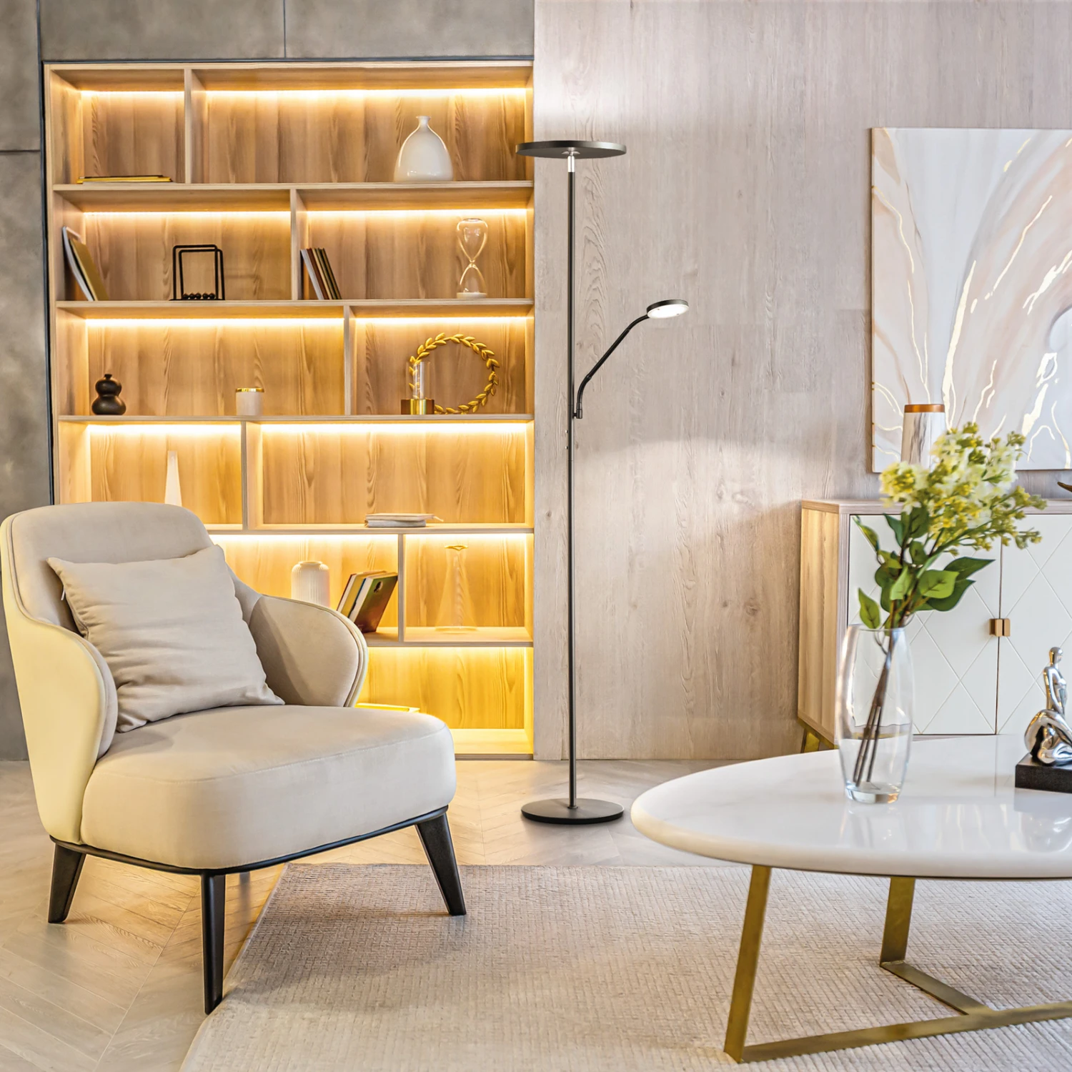 Die LED-Stehleuchte Fabi verfügt über einen flachen, runden Schirm, der das Licht Richtung Decke abstrahlt und für eine schöne indirekte Beleuchtung sorgt. Der Schirm ist an einem kleinen Gelenk befestigt und kann somit verstellt werden. Die kleinere Leuchte strahlt das Licht zum Boden ab und kann wunderbar als Leselampe genutzt werden. Die Stehleuchte eignet sich demnach ideal zur Verwendung im Wohnzimmer, kann aber auch in anderen Räumlichkeiten genutzt werden. Die Helligkeit der Leuchte lässt sich mit dem integrierten Dimmer problemlos variieren. Außerdem ist es möglich, die Farbtemperatur in drei Stufen einzustellen.