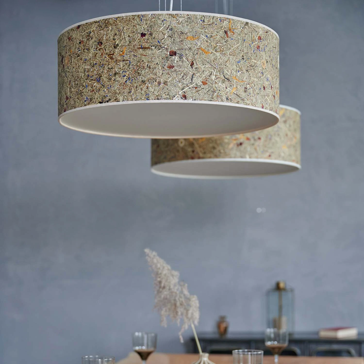 Die zylindrische Form der Hängeleuchte Discus ist bewusst schlicht gewählt, um nicht von der aufregenden Oberfläche des Schirms abzulenken. Das Pendel wird aus handgesenstem Bio-Almheu aus Tirol gefertigt und mit feinen Blüten verziert. Das besondere Design macht nicht nur optisch etwas her, man kann sich auch an dem wundervollen Duft des Almheus erfreuen. Der Diffusor sorgt für eine gleichmäßige Verteilung des blendfreien Wohlfühllichts. Es empfiehlt sich die Anbringung in Essbereichen, Bars, Wohnzimmern oder Lobbies.