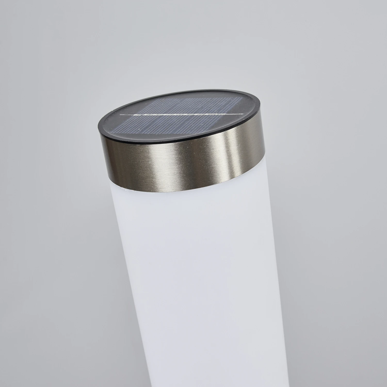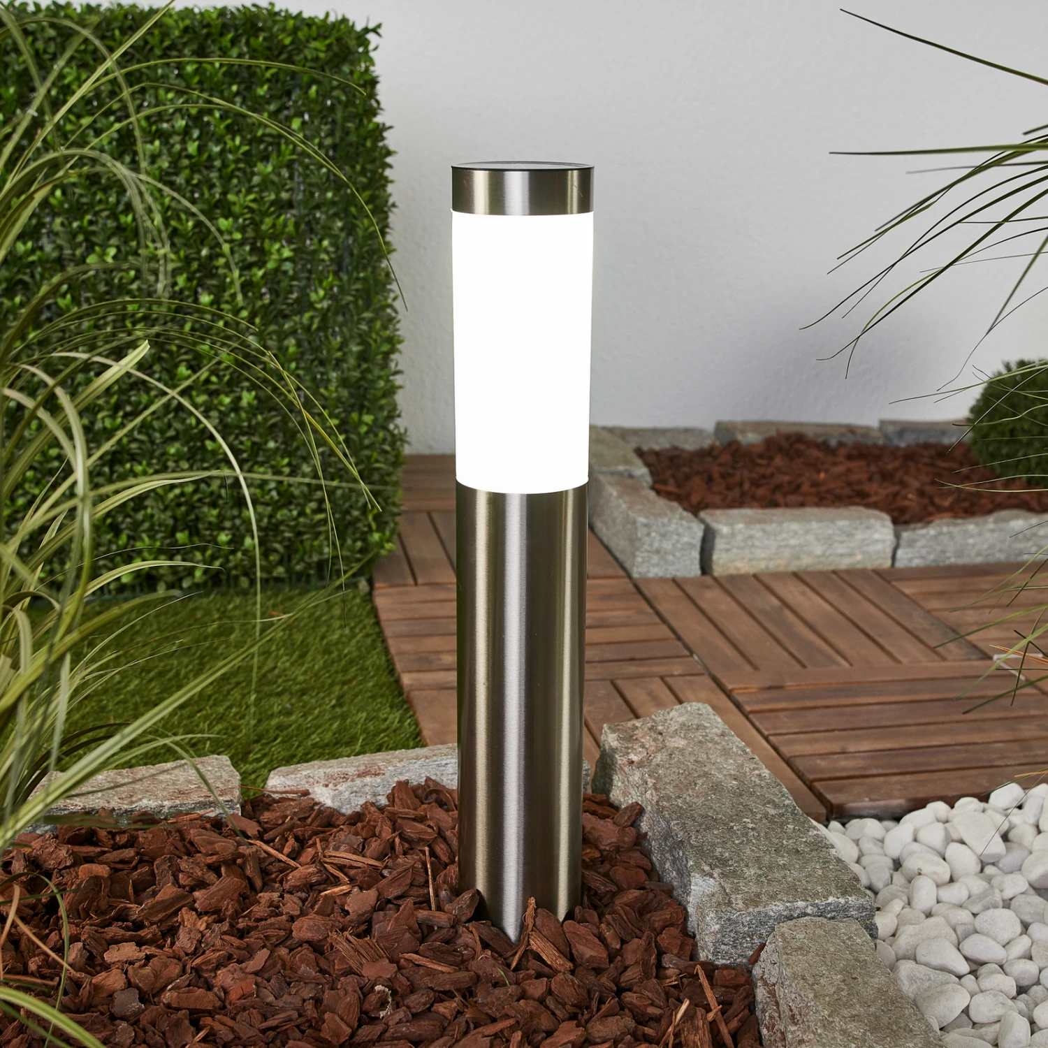 Aleeza hat eine zylindrische Gestalt und ist unten aus Edelstahl gefertigt, während oben ein Aufsatz aus weißem Kunststoff sitzt. Dahinter verbergen sich die LEDs und der Lichtschein ist gleichmäßig und sanft. Mittels des Erdspießes kann man die LED-Solarleuchte fest im Erdreich verankern, so dass sich Aleeza gut für Pflanzbeete und Gartenwege eignet. Dort erzielt man dann ein sanftes Orientierungslicht, damit man nicht völlig im Dunkeln tappt, wenn man das Haus verlässt. Die Leuchte wird in dreifacher Ausführung geliefert.