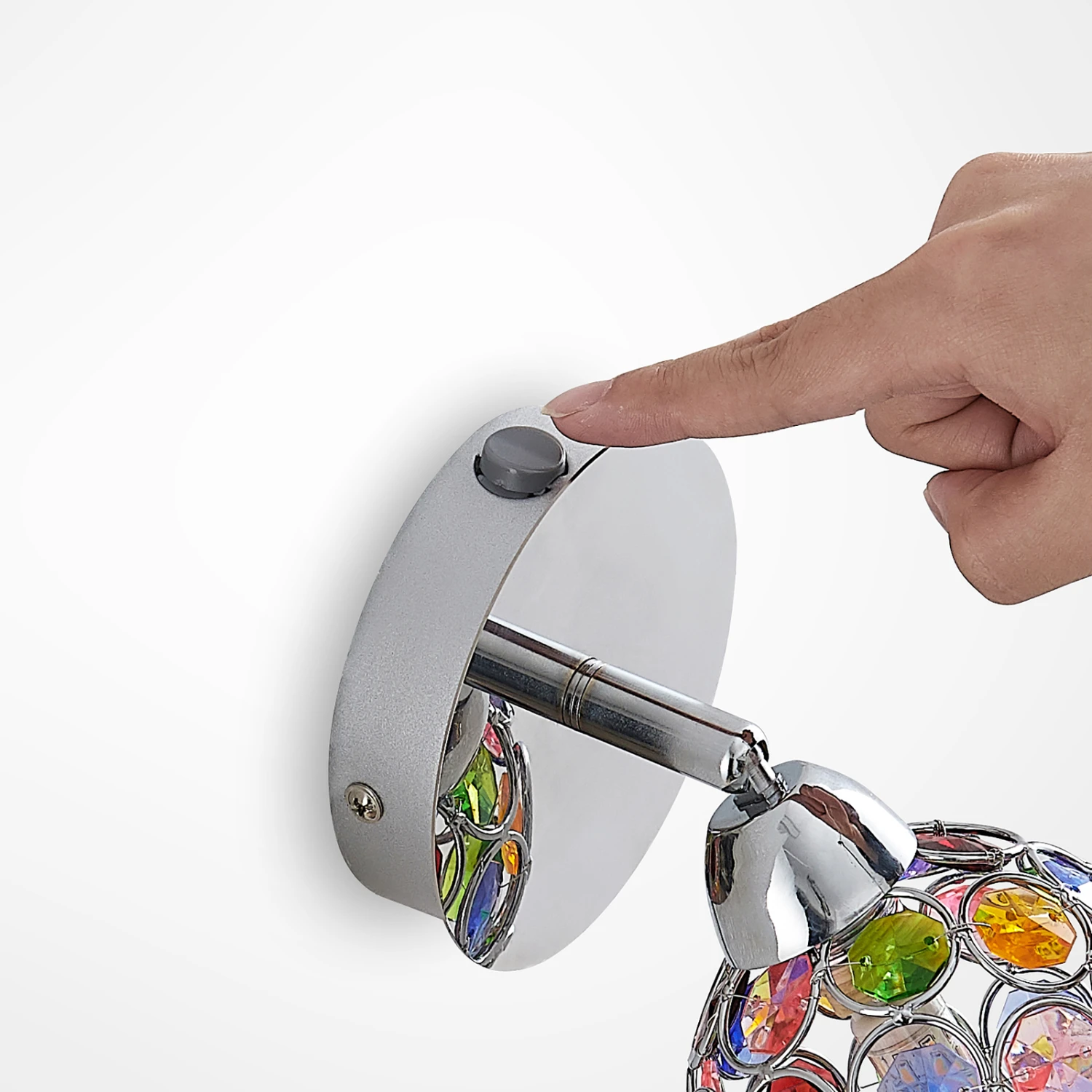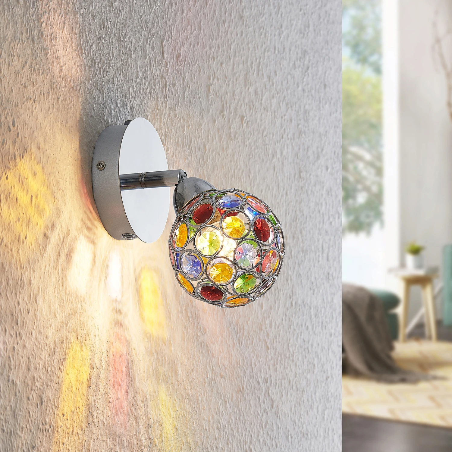 Verchromtes Metall als runde Wandhalterung, Ausleger und Fassung und ein Kugelschirm, der aus einem Metallgerüst mit darin angebrachten, verschiedenfarbigen Kunststoffelementen mit geschliffenen Kanten – das ist die Wandleuchte Dottys, die Farbe in jeden Raum bringt.