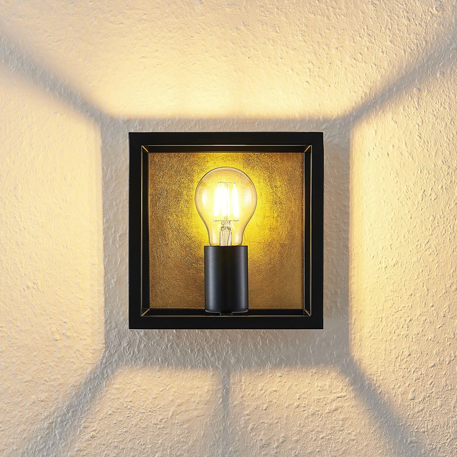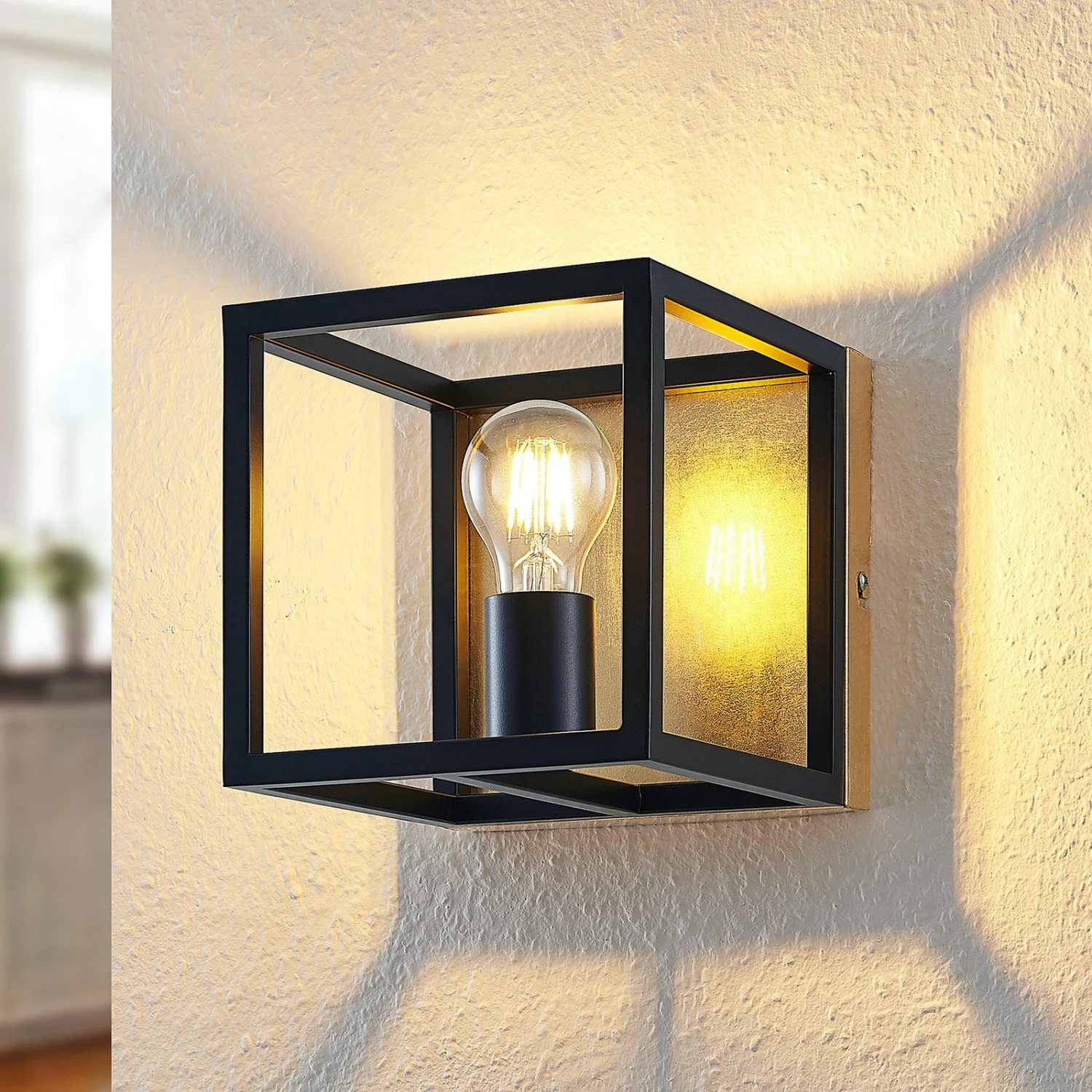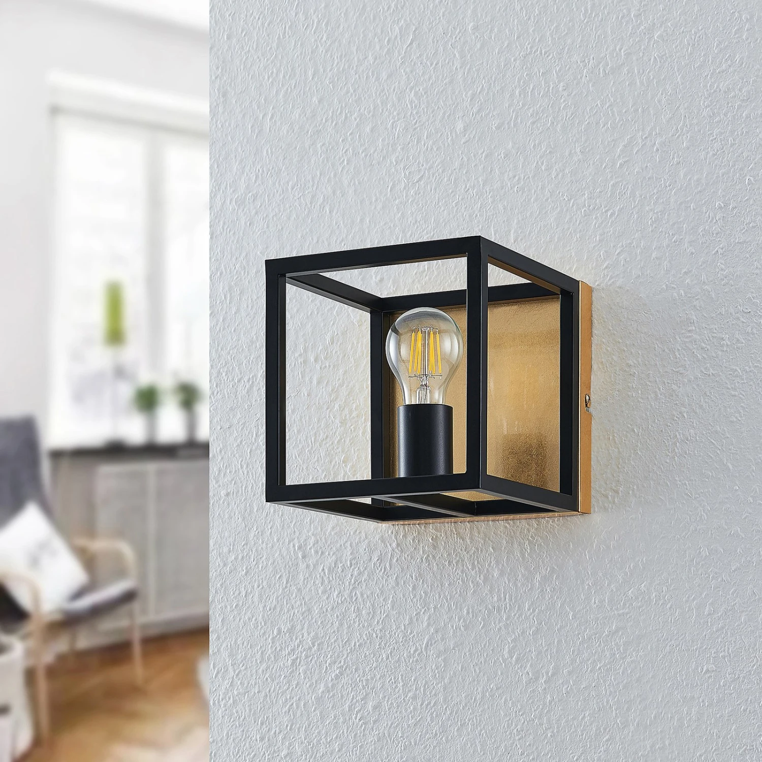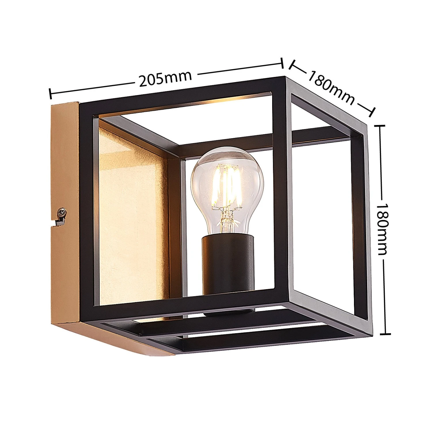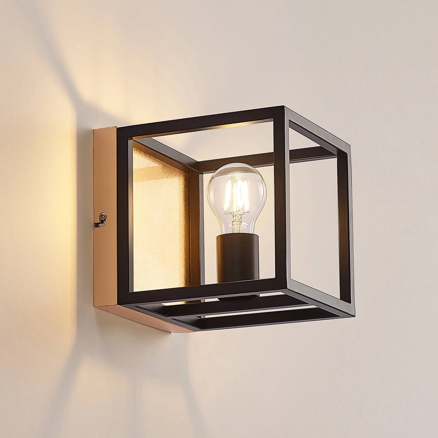 Wandlampe Miravi mit schwarzem Rahmen in Würfelform und dekorativem Goldfolienfinish Miravi passt exzellent zu einer modernen Umgebung, kann aber auch eine gewisse Vintage-Note nicht leugnen. Es gibt keinen herkömmlichen Lampenschirm, stattdessen besitzt die Wandleuchte einen Rahmen in Würfelform, der sich um das Leuchtmittel fügt und zu allen Seiten hin offen ist. Dieser Rahmen gleicht einem Käfig und ist in Schwarz gehalten, während die Wandhalterung mit einer Tönung in Gold dagegenhält und einen sehenswerten Kontrast erschafft, der nicht nur die Optik der Leuchte bereichert, sondern auch die Lichtwirkung beeinflusst, weil der Lichtschein wärmer reflektiert wird und auf diese Weise mit einer eleganten Ausstrahlung punktet. Optisch passen LED-Filamentlampen am besten zum Gesamtbild, weil sie den klassischen Glühlampenlook verkörpern. Außerdem sind diese modernen Leuchtmittel auch sehr sparsam im Energieverbrauch und überzeugen auch in dieser Hinsicht.