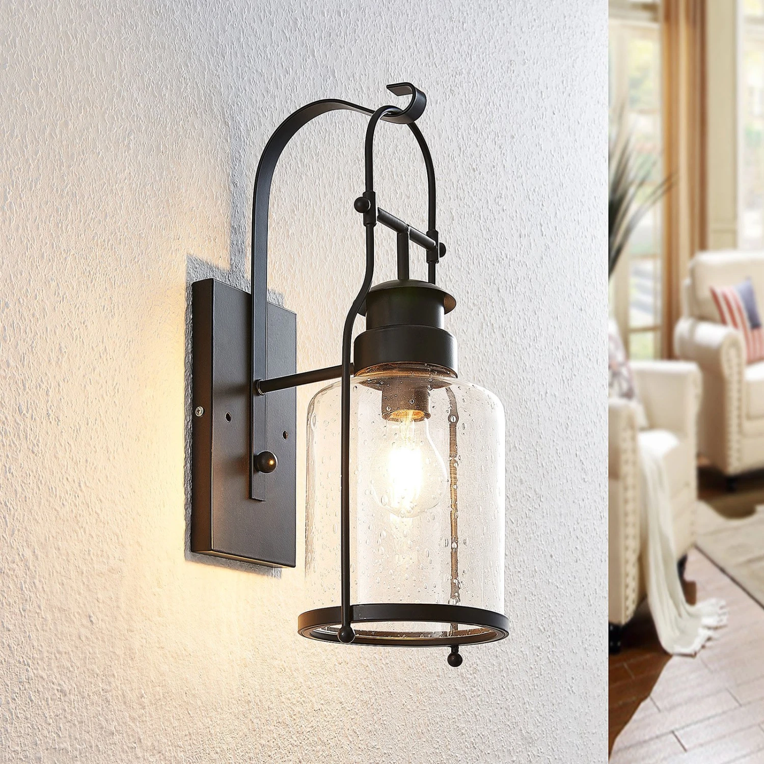 Nostalgisches Design aus schwarzem Metall und Glas: die Wandleuchte Rozalie in Laternenoptik