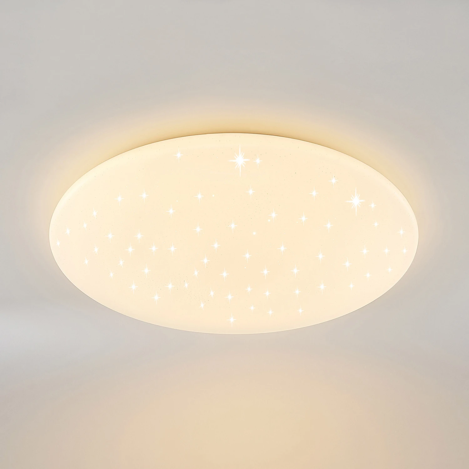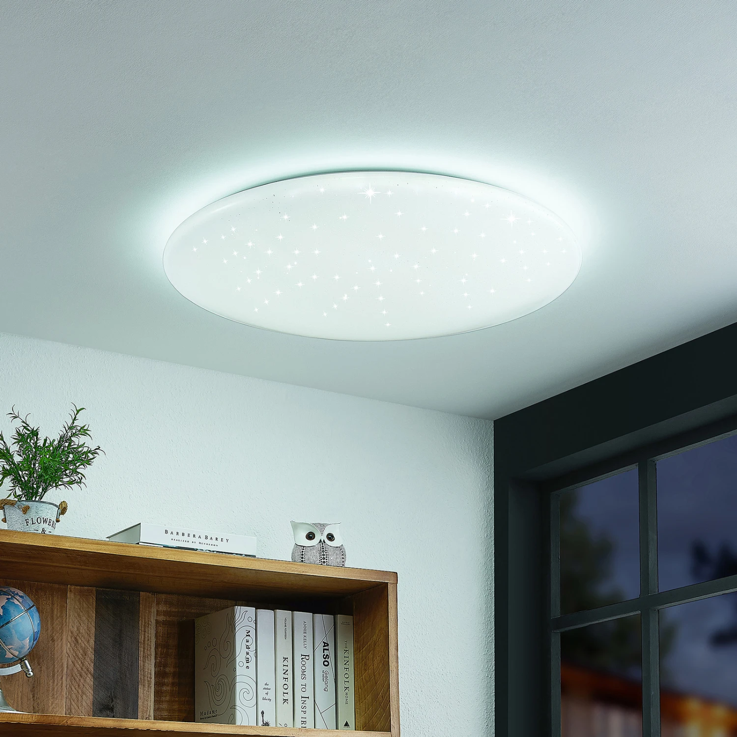 Die LED-Deckenlampe Wedja ist mit ihrem auffallenden Leuchtenschirm etwas ganz Besonderes und eignet sich als stilvoller Dekorationsgegenstand für den Innenbereich. Die Leuchte besteht aus Stahl und Kunststoff und ihr runder Leuchtenschirm erscheint in einem attraktiven Weiß, welches mit funkelnden Elementen versetzt ist. Die dahinter liegenden, festverbauten LEDs lassen sich mit Hilfe einer Fernbedienung hinsichtlich ihrer Lichtfarbe stufenlos steuern (3.000 K – 6.500 K). Das frische Aussehen der LED-Deckenleuchte Wedja zieht neugierige Blicke auf sich und setzt stimmige Akzente an Wohnungsdecken.