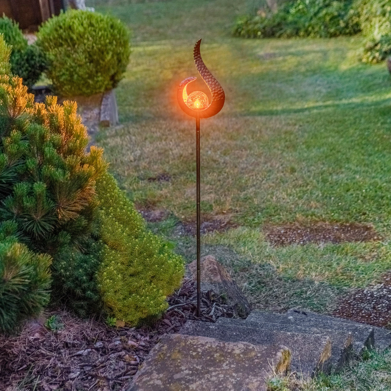 Yonca ist eine attraktive Ergänzung für das Ambiente im Außenbereich. Ihr besonderes Design besteht aus einer schlanken Stange, die einen Leuchtenschirm trägt, der eine spannende Form besitzt. Innerhalb dieses Schirmes sitzt eine Glaskugel, in der LEDs fest verbaut sind. Diese LEDs generieren eine gemütliche, warmweiße Beleuchtung, die sich vor allem für einen Garten oder eine Terrasse eignet. Nach Bedarf kann die LED-Solar-Dekoleuchte Yonca mit weiteren Lampen ihrer Serie kombiniert werden, um einen stimmigen Gesamteindruck zu schaffen.