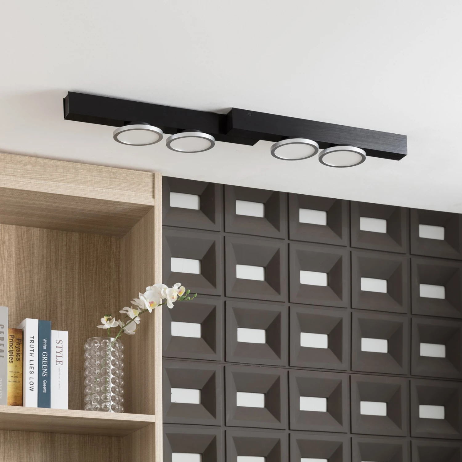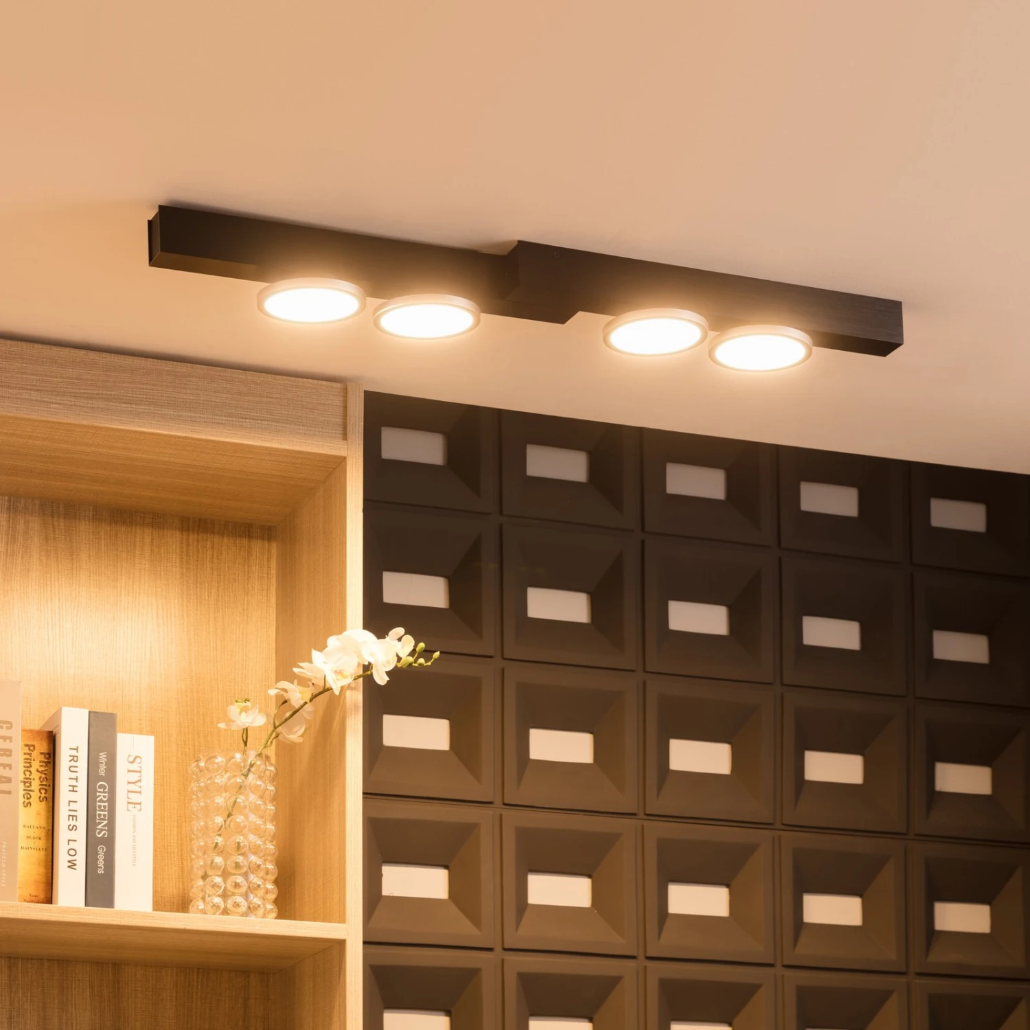 Vierflammige Design-LED-Deckenleuchte KellinoLassen Sie sich von dieser formschönen Deckenleuchte begeistern. Das Modell Kellino liefert eine ansprechende warmweiße Lichtfarbe zum Wohlfühlen. Die vier Leuchtmittel können ausgetauscht werden. Die Deckenleuchte hat eine GU10-Fassung. Die schwarze Lampe vervollständigt Ihr persönliches Einrichtungskonzept dank ihres modernen Stils, der auf Ingo Thiele zurückgeht. Sie ist universell anwendbar und vervollständigt geschmackvoll jeden Raum Ihres Zuhauses. Das Modell Kellino überzeugt in gewohnter Qualität der Marke Lucande und steht somit für durchdachtes Design und ein einzigartiges Wohnerlebnis. Auch ausgeschaltet kann die Leuchte einen dekorativen Zweck erfüllen.