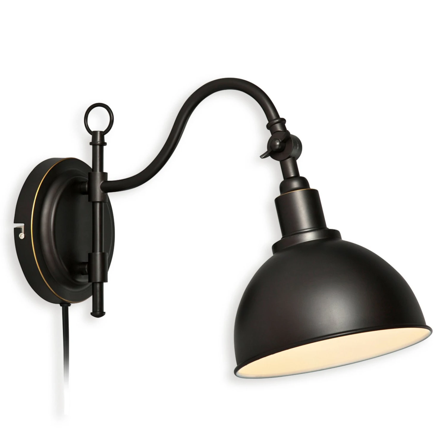 Die Wandleuchte Ekelund lässt trotz ihrer dunklen Farbgestaltung keine trüben Gedanken aufkommen, denn die weiße Innenlackierung des Schirms sorgt für ein helles und wohnliches Licht. Der Leuchtenkopf kann gekippt werden.