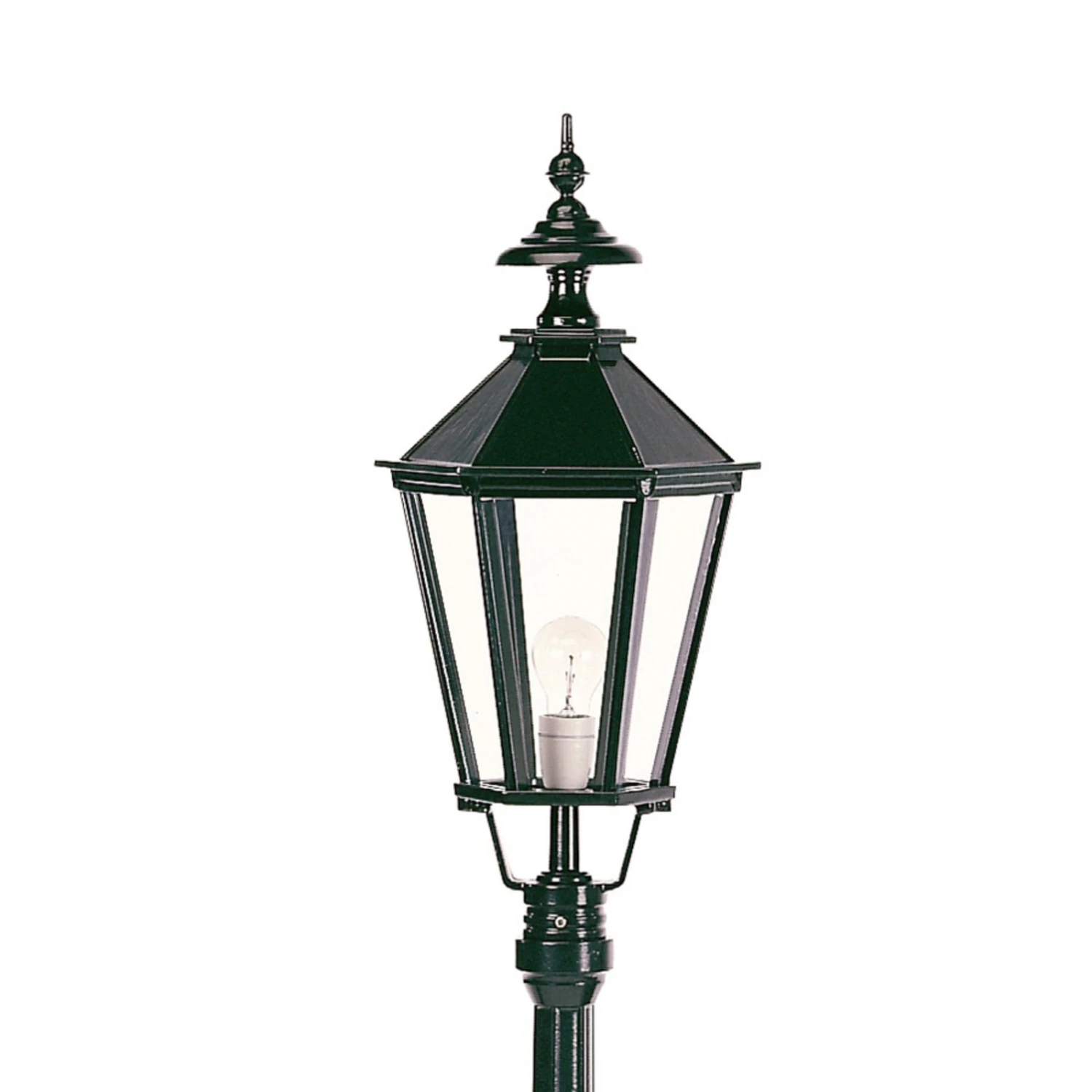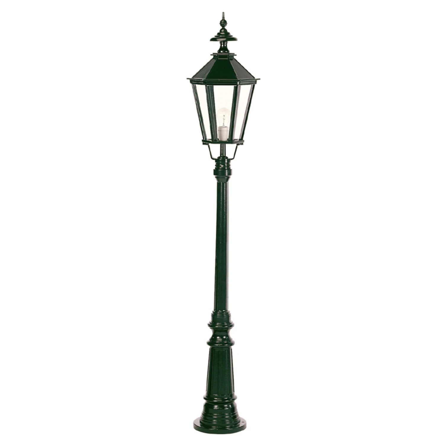 Diese Mastleuchte überzeugt mit einer stabilen Bauart und ist in ihrem antiken Design immer wieder schön anzusehen. Die glänzende Lackierung fügt sich in unterschiedlichste Außenbereiche nahtlos ein und sorgt für stimmungsvolle und effektive Beleuchtung. Eine formschöne Spitzhaube krönt diese Leuchte und unterstreicht das elegante Design.