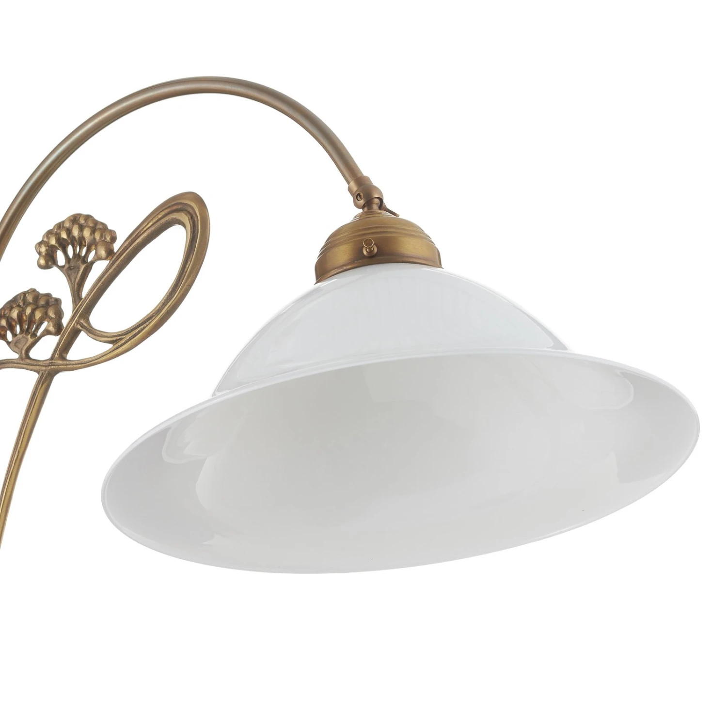 Die an alte Vorlagen um 1900 angelehnte Stehleuchte ALWINE ist mit Lesearm und Fluter ausgestattet. Vorwiegend Messingteile werden von Hand mit dem Schirm aus mundgeblasenem Glas verbaut. Sogar das historisch anmutende Textilkabel passt zum Stil. Natürlich ist die Technik aber von heute! Die Arme lassen sich in der Höhe verstellen und sind mit einem Jugendstil-Dekoelement vervollständigt. Aus sogenanntem Berliner Messing wurde das Gestell gefertigt; eine nicht lackierte Patina sorgt für eine robuste Oberfläche. Die Reinigung erfolgt mit einem weichen Tuch ohne Putzmittel.