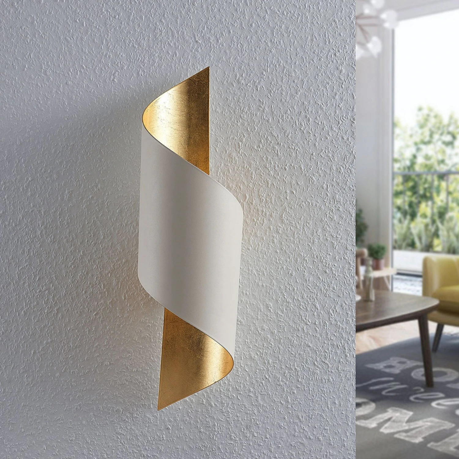 Die Wandleuchte Vanni besteht aus einem eingerollten Metallschirm, der außen in zeitlosem Weiß gehalten ist, während die Schirminnenseite golden getönt ist. Das kommt nicht nur der allgemeinen Optik zugute, sondern sorgt auch für eine fabelhafte Lichtstimmung mit einem sehr gemütlichen Ausdruck und einem faszinierenden Spiel aus Schatten und Licht. Mit diesen Eigenschaften eignet sich die Metallwandleuchte hervorragend für Wohnräume oder kann auch in einem Schlafzimmer oder im Flurbereich angebracht werden. Dabei ist die Leuchte jedoch auch schon im uneingeschalteten Zustand ein echter Blickfang.