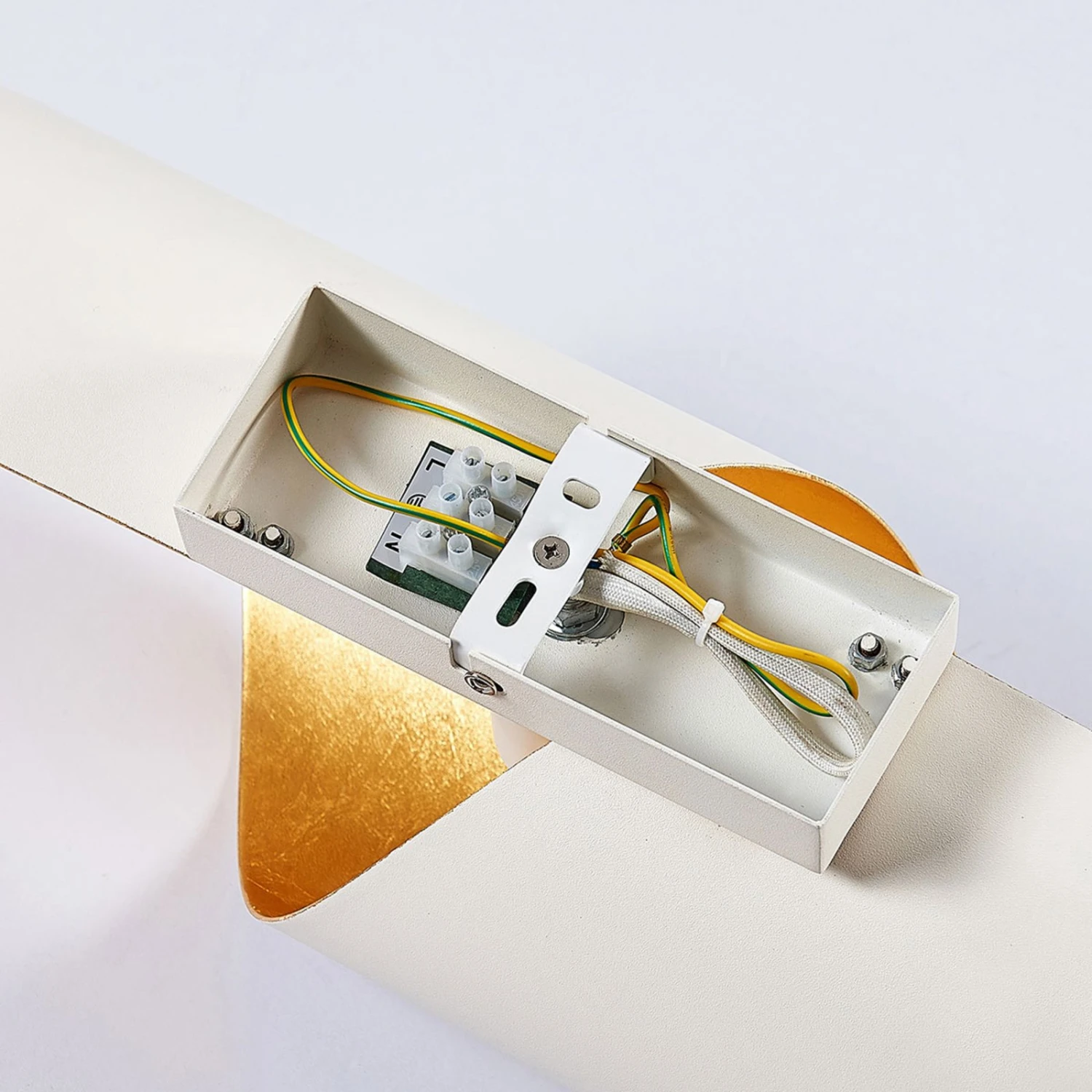 Weiß-goldene Wandlampe Vanni mit außergewöhnlich geformtem Metallschirm – ideal für eine gemütliche Akzentbeleuchtung