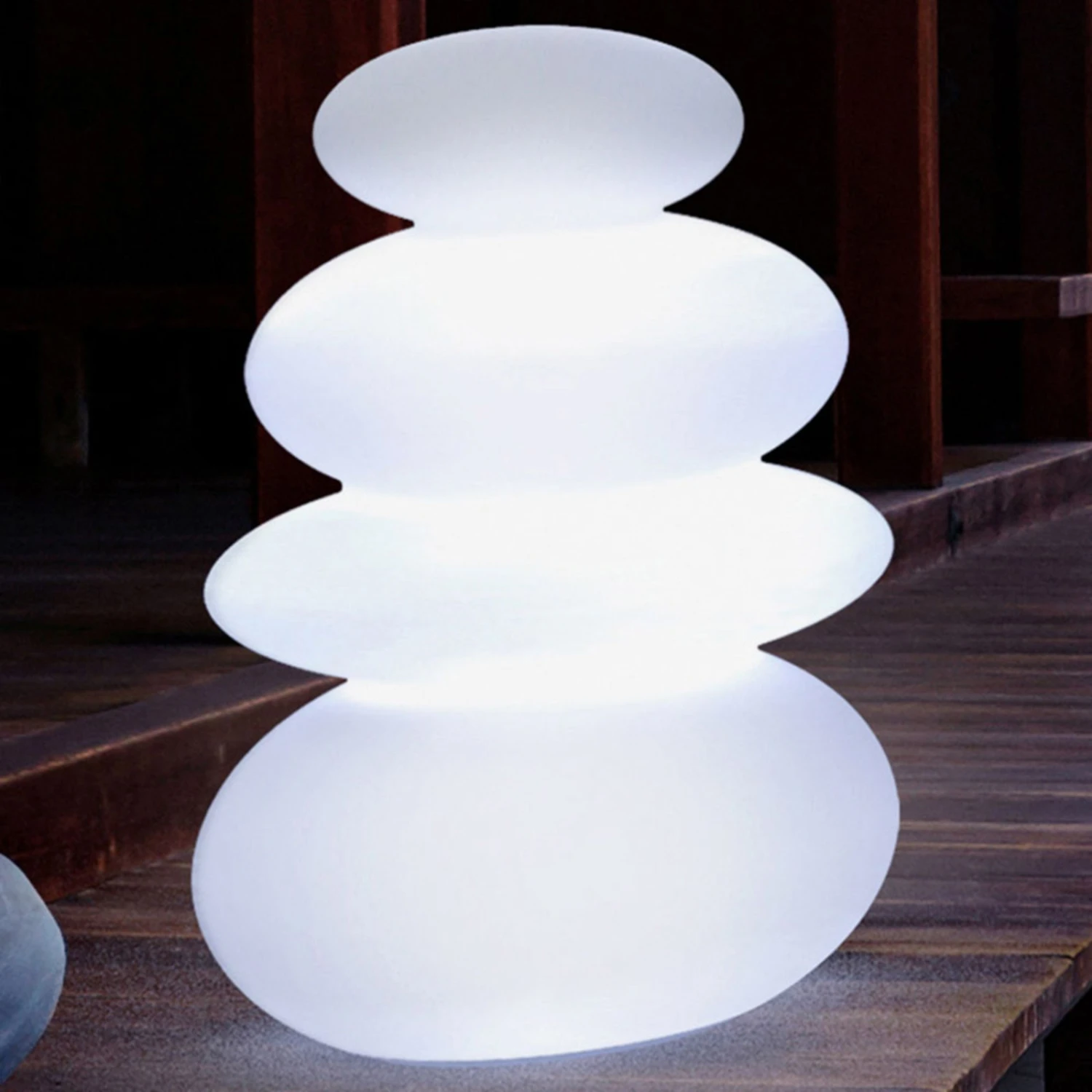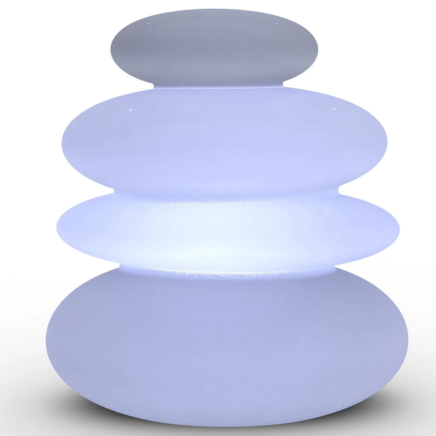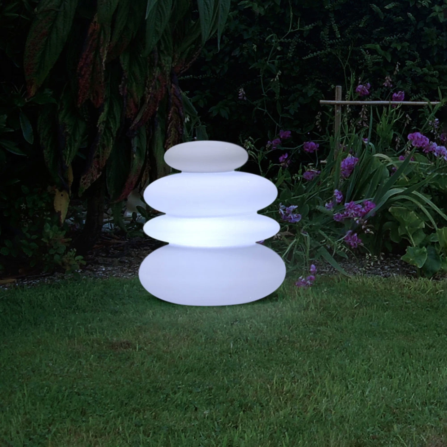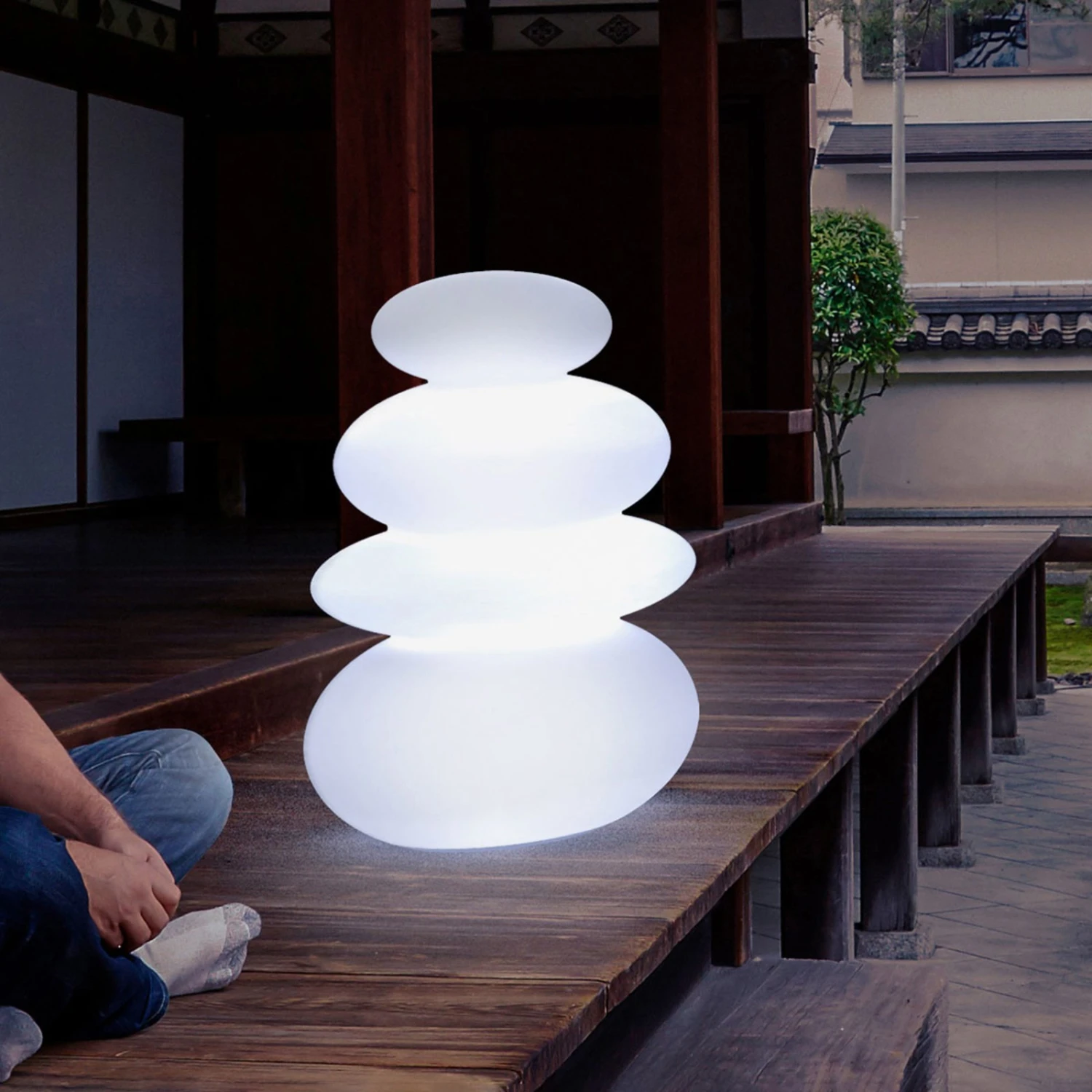 Aus robustem, wetterfestem und uv-beständigem Polyethylen wurde die dekorative Stehleuchte Balans hergestellt. Vier flache Steine bilden einen Turm, der beleuchtet und unbeleuchtet sehr dekorativ wirkt und Ruhe und Gelassenheit ausstrahlt, ganz nach dem Zen-Gedanken.