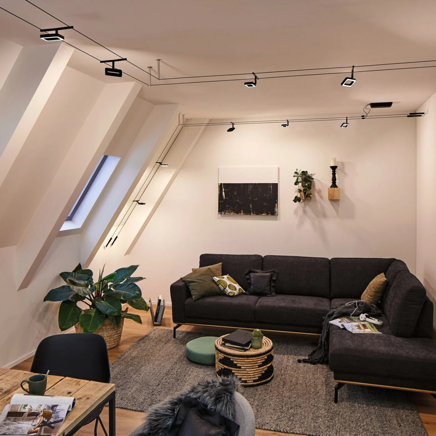 Das Seilsystem Frame wird anschlussfertig als Komplettset aus Seil, Trafo und fünf eckigen Leuchten geliefert. Die als rechteckige Rahmen gestalteten Einzelleuchten lassen sich nicht nur an beliebiger Stelle am Seil positionieren, sondern auch drehen und schwenken, so dass die einzelnen Leuchten in verschiedene Richtungen strahlen können. Das macht ein Seilsystem zur idealen Leuchte für lange Flure oder verwinkelte Räume. Das Seilsystem Frame kann an der Decke, aber auch an einer Dachschräge oder an der Wand montiert werden. Es ist mit energieeffizienten, warmweiß leuchtenden LEDs bestückt und ist damit eine zeitgemäße und energiesparende Lichtquelle zur Grundbeleuchtung eines Raumes.