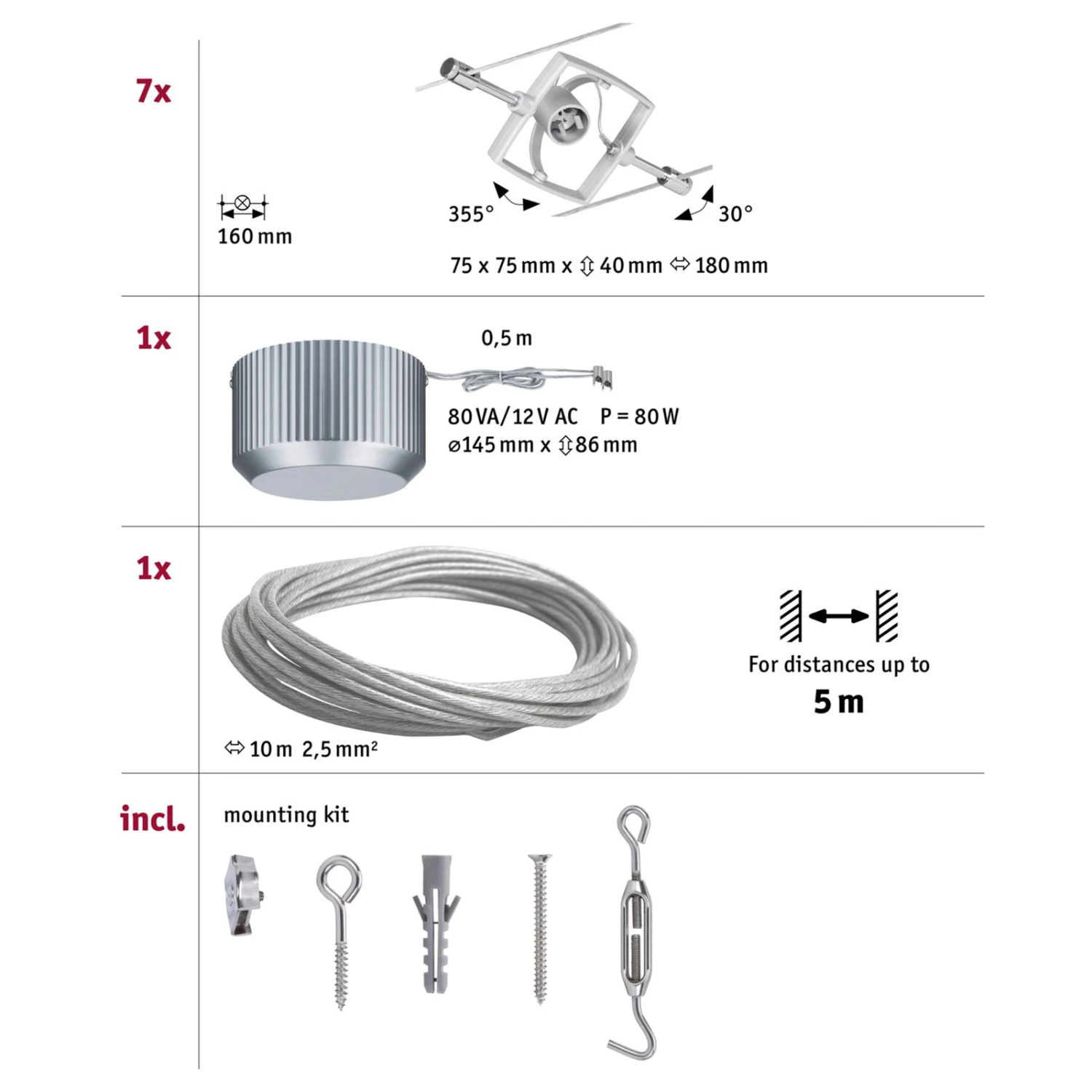Als anschlussfertiges Komplettset wird das Seilsystem Wire Mac II geliefert. Es besteht aus einem 10 m langen Seil, sieben Leuchten mit GU5,3-Fassung, die sich beliebig am Seil positionieren lassen, einem Trafo sowie Montagematerial. Das Seilsystem bietet sich zur Beleuchtung großer Räume oder langer Flure an und kann nicht nur an der Decke, sondern auch an der Wand oder an der Dachschräge befestigt werden.