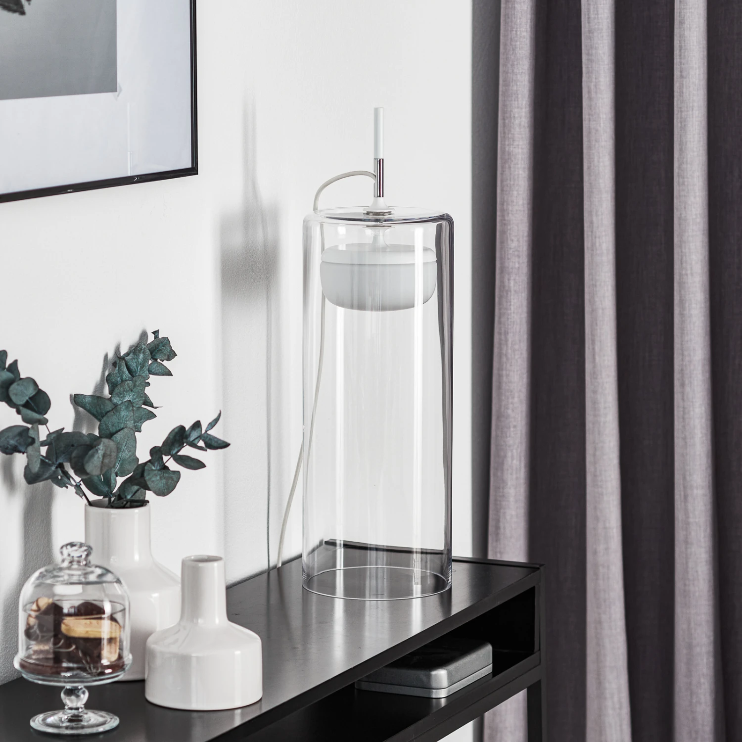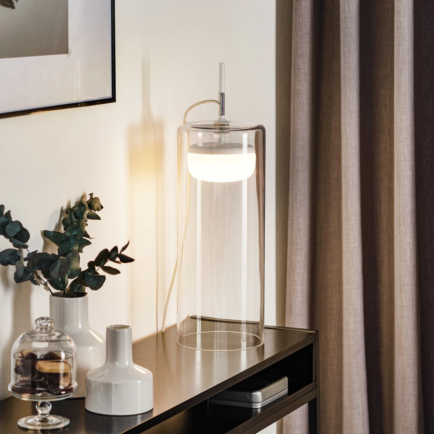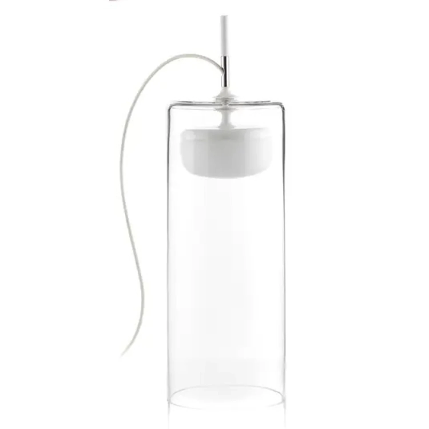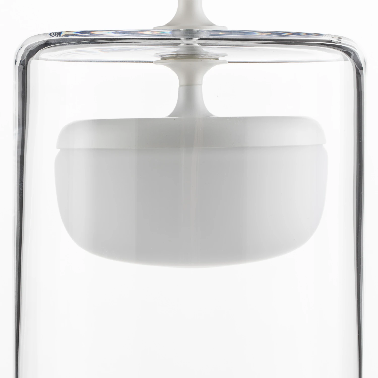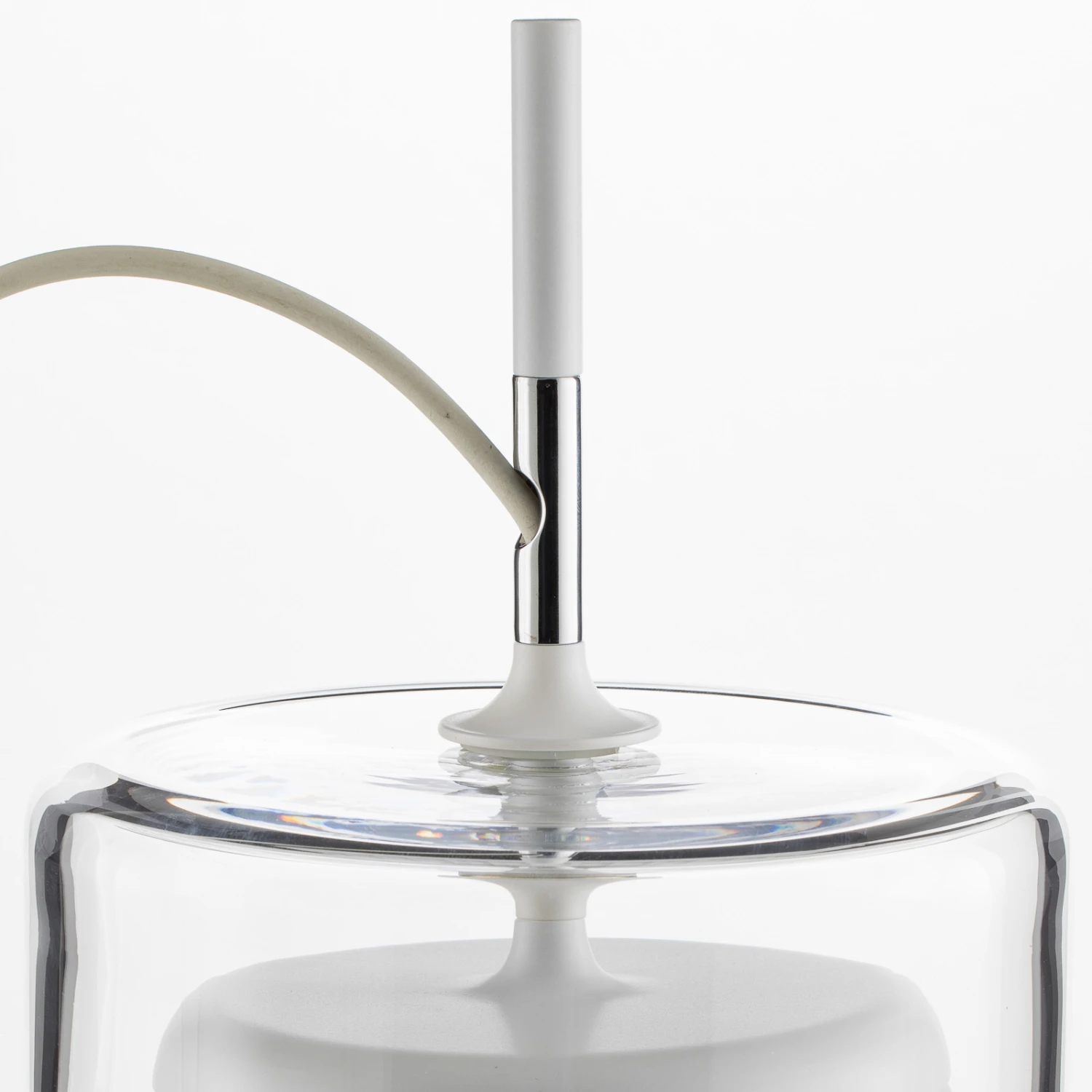 In interessantem Design mit mundgeblasenen Glasschirmen wurde die LED-Tischleuchte Diver gestaltet. Der äußere Schirm in Zylinderform umgibt einen inneren, opalweißen Schirm, der annähernd die Form einer Halbkugel hat. Beide Schirme bestehen aus mundgeblasenem Glas, wobei der innere durch seine opalweiße Färbung eine gleichmäßige Streuung des Lichts bewirkt. Lackierte Metallelemente als oberer Abschluss des weißen Diffusors und als Halterung bilden einen effektvollen Kontrast.