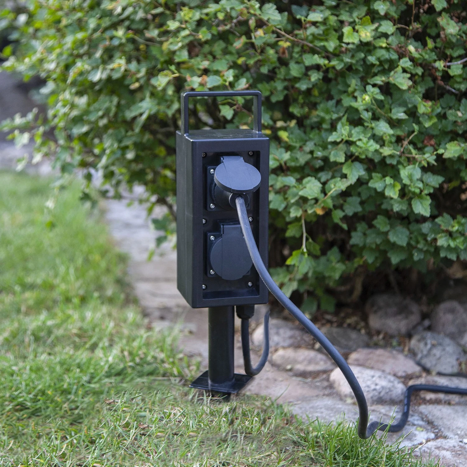 Die Vierfach-Außensteckdose Plugge kann dank des Erdspießes schnell und unkompliziert am gewünschten Ort in den Boden gesteckt werden und mit einem 200 cm langen Kabel mit Stecker ausgestattet, um sie an einer anderen Steckdose oder einem Verlängerungskabel anzuschließen. Sie bietet eine flexible Anschlussmöglichkeit zur Versorgung elektrischer Geräte im Außenbereich mit einer maximalen Gesamtleistung von 3860 W.