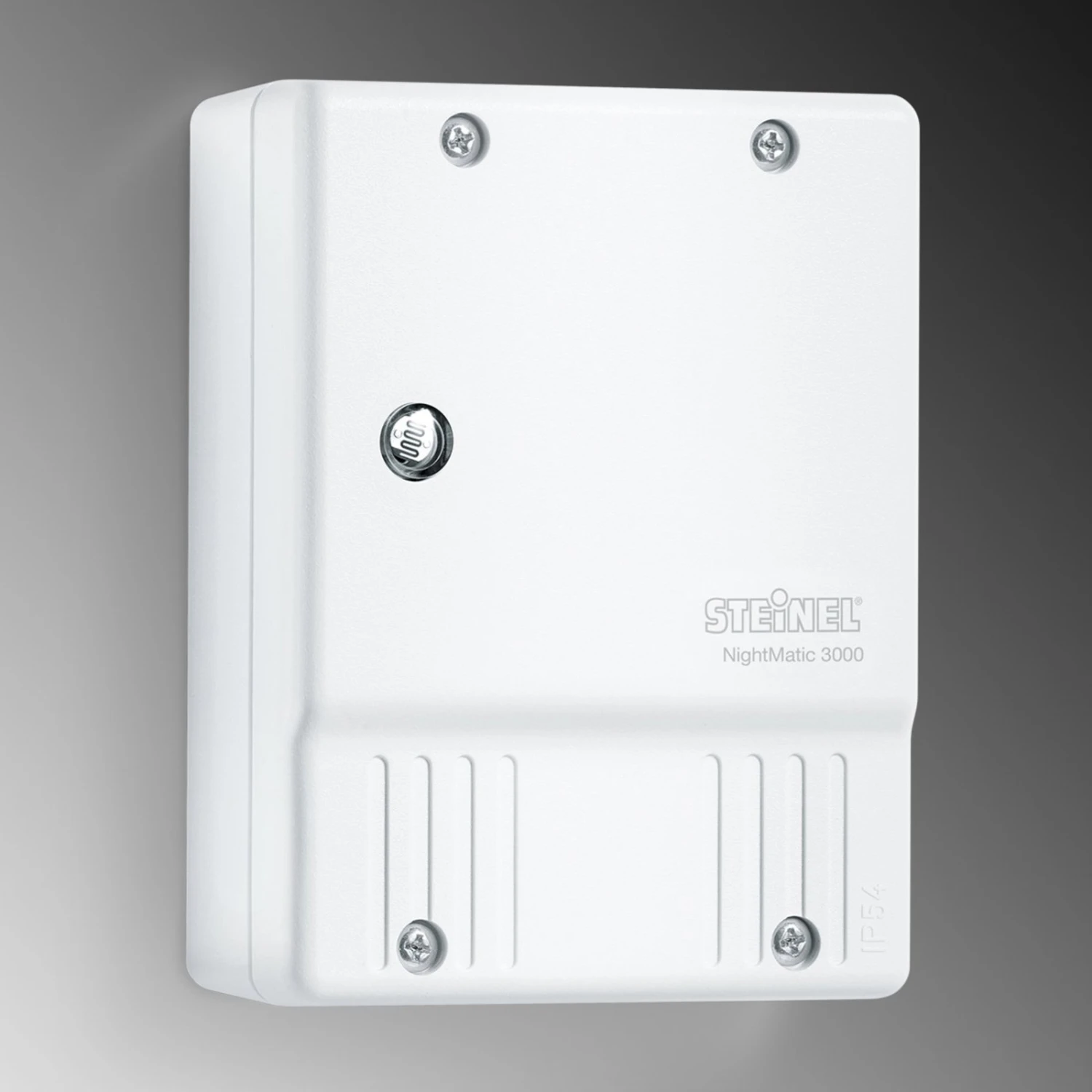Der NightMatic 3000 registriert die Umgebungshelligkeit und schaltet angeschlossene Leuchten am Abend bei Erreichen der Dämmerungsschwelle automatisch ein und im Morgengrauen wieder aus. Mit seinem Vario Nachtsparmodus hilft er zusätzlich Strom sparen. Auf Wunsch schaltet er das Licht des nachts nach einer programmierbaren Zeit selbsttätig aus und morgens gegen 5 Uhr – falls es dann noch dunkel ist – wieder ein. Er ist mit Eigenlichtkompensation ausgestattet, d. h. eine fremde Leuchte in der Nähe ist nicht funktionsstörend.