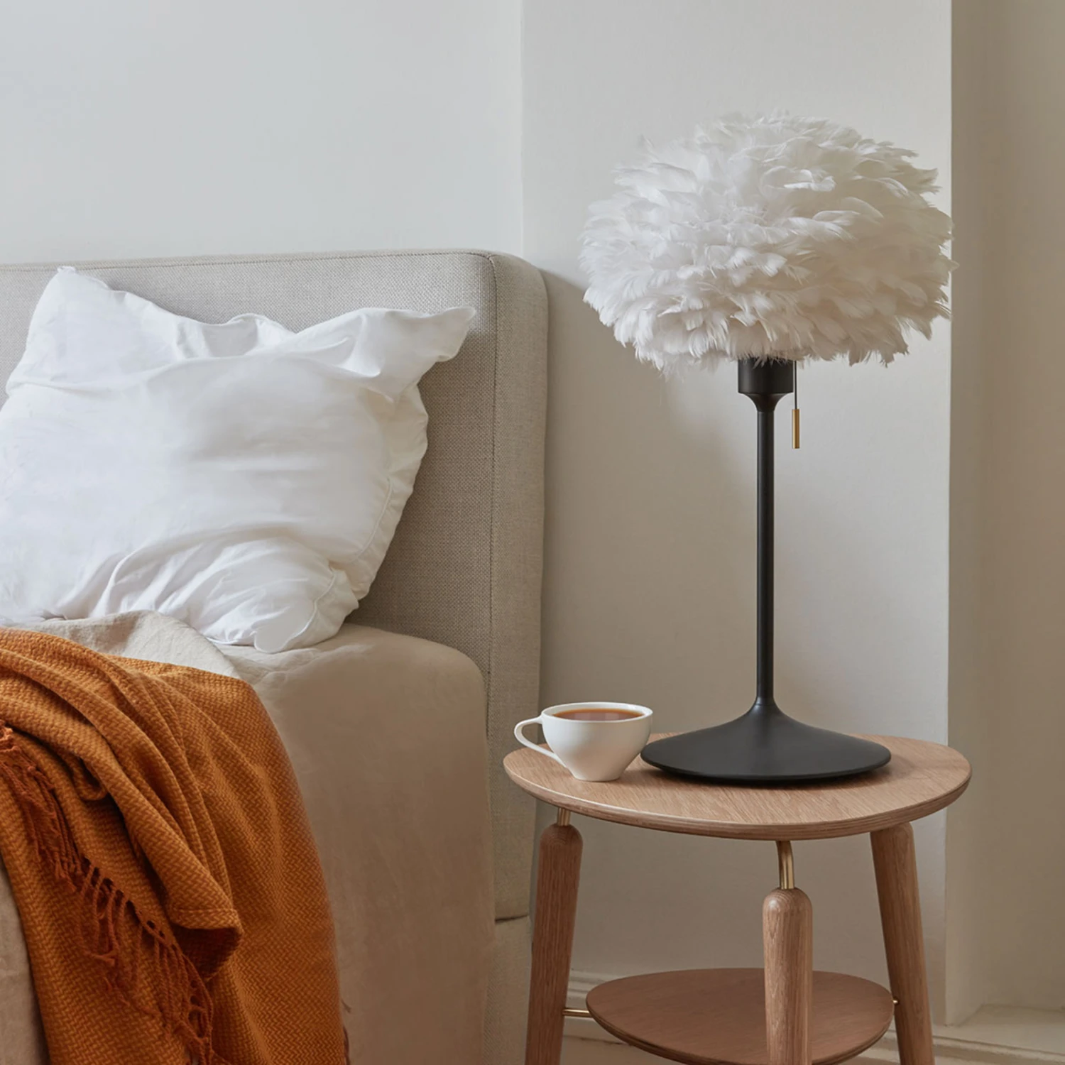 Tischleuchte Eos mini – Schirm aus Federn auf schwarzem Stativ