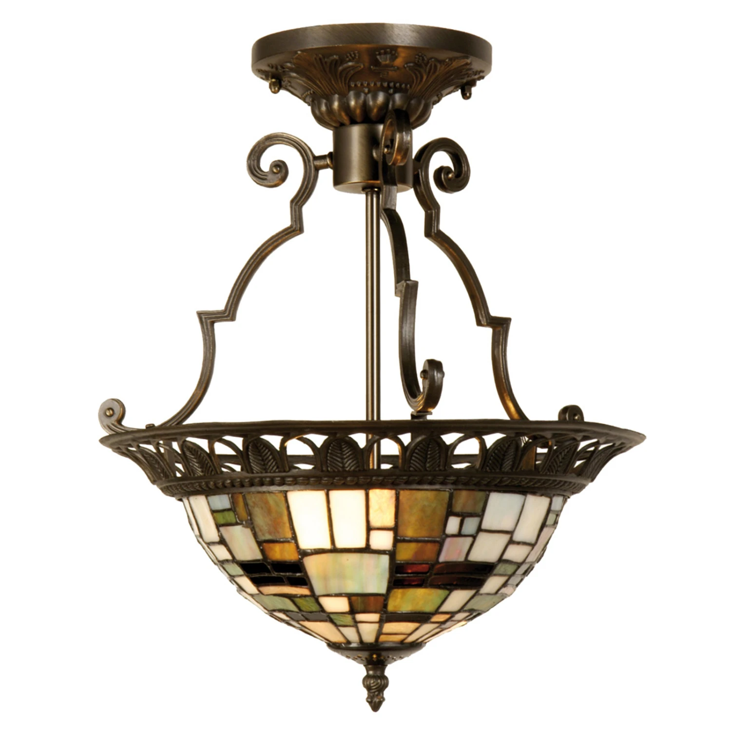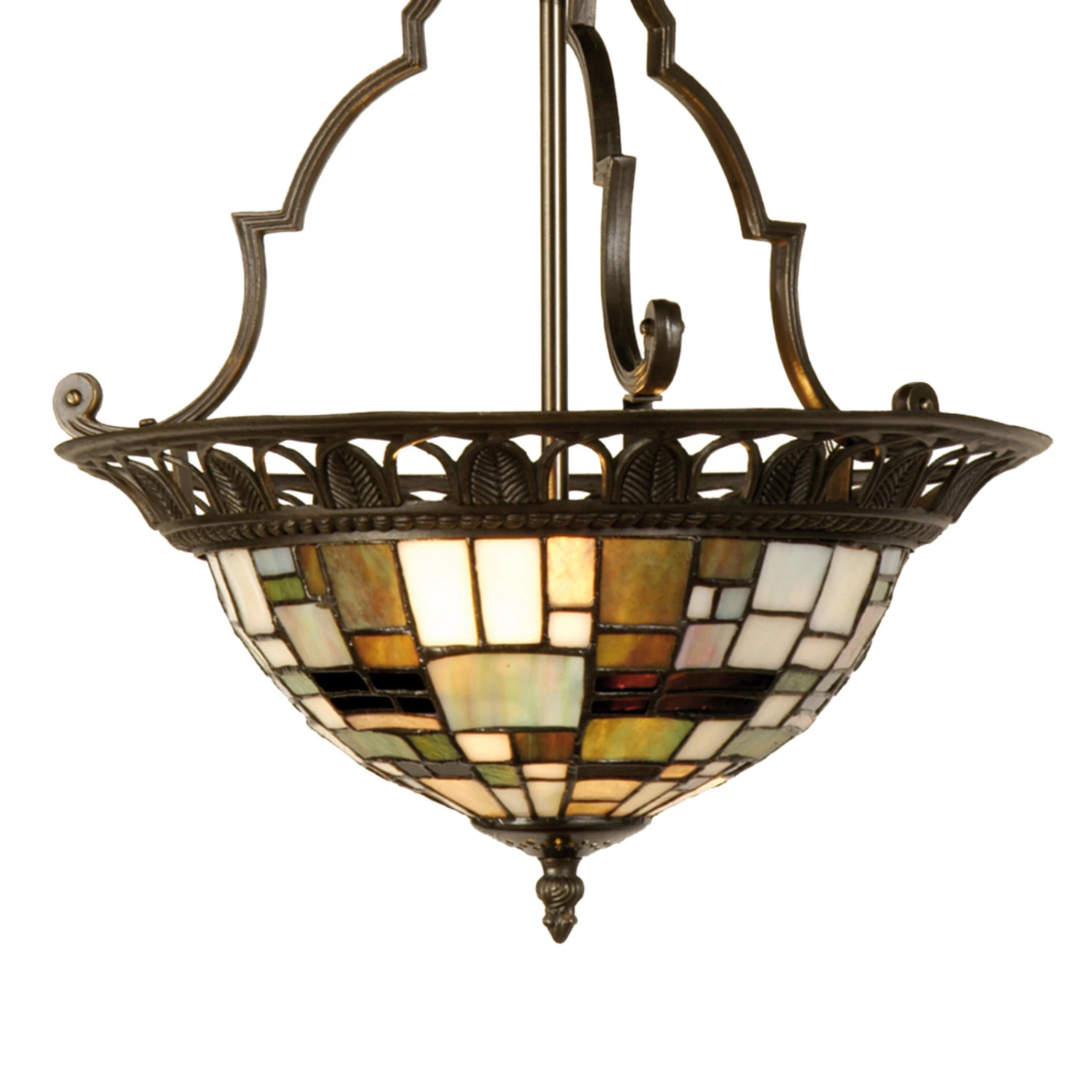 Durch ihren Abstand zur Decke könnte man diese Deckenleuchte zunächst auch für eine Hängeleuchte halten. Der Schirm der Leuchte im Tiffany-Stil setzt sich aus verschieden farbigen Glasteilen zusammen, die gemeinsam ein Mosaik ergeben. Durch die dunkleren und die helleren Glasteile spendet sie Licht in unterschiedlicher Intensität.