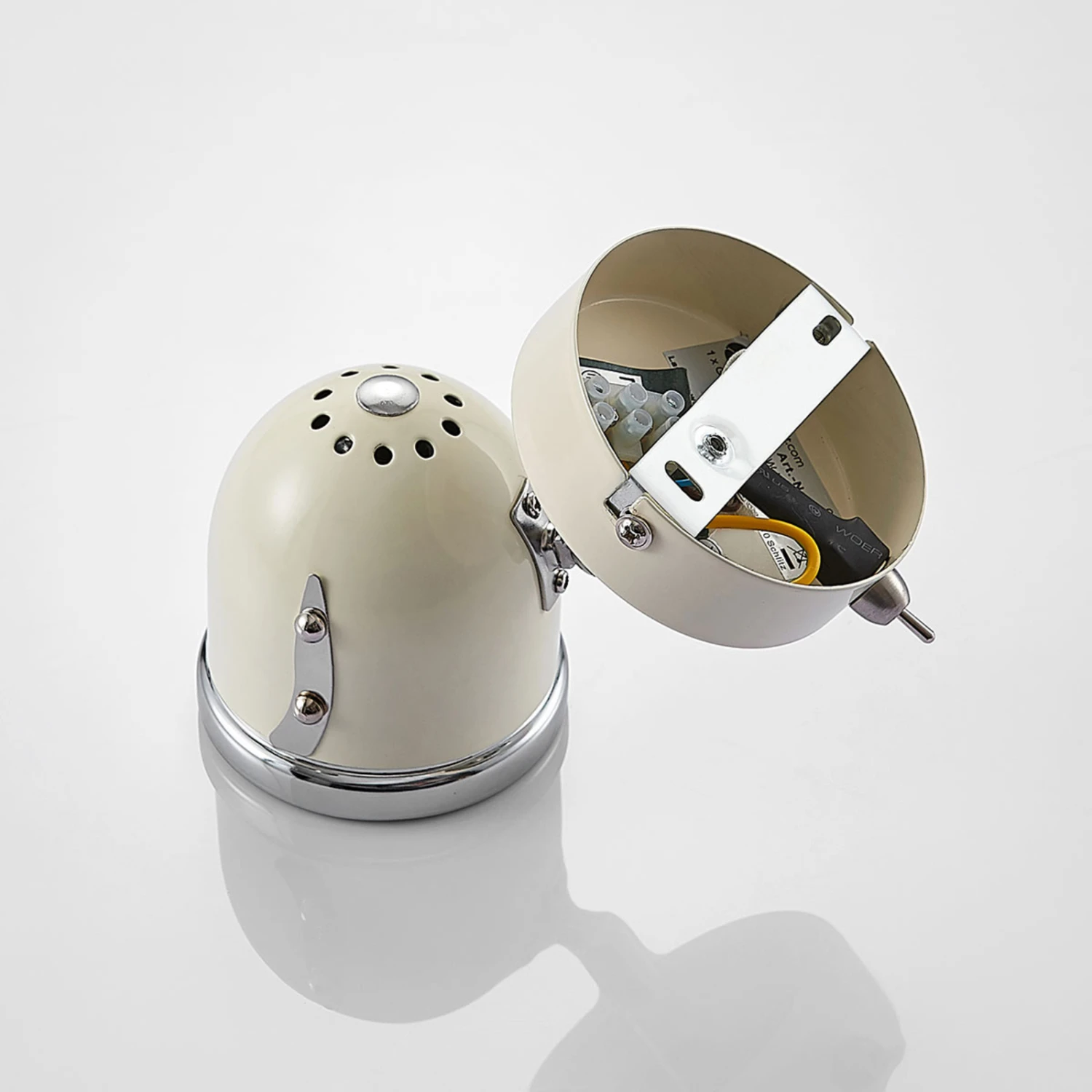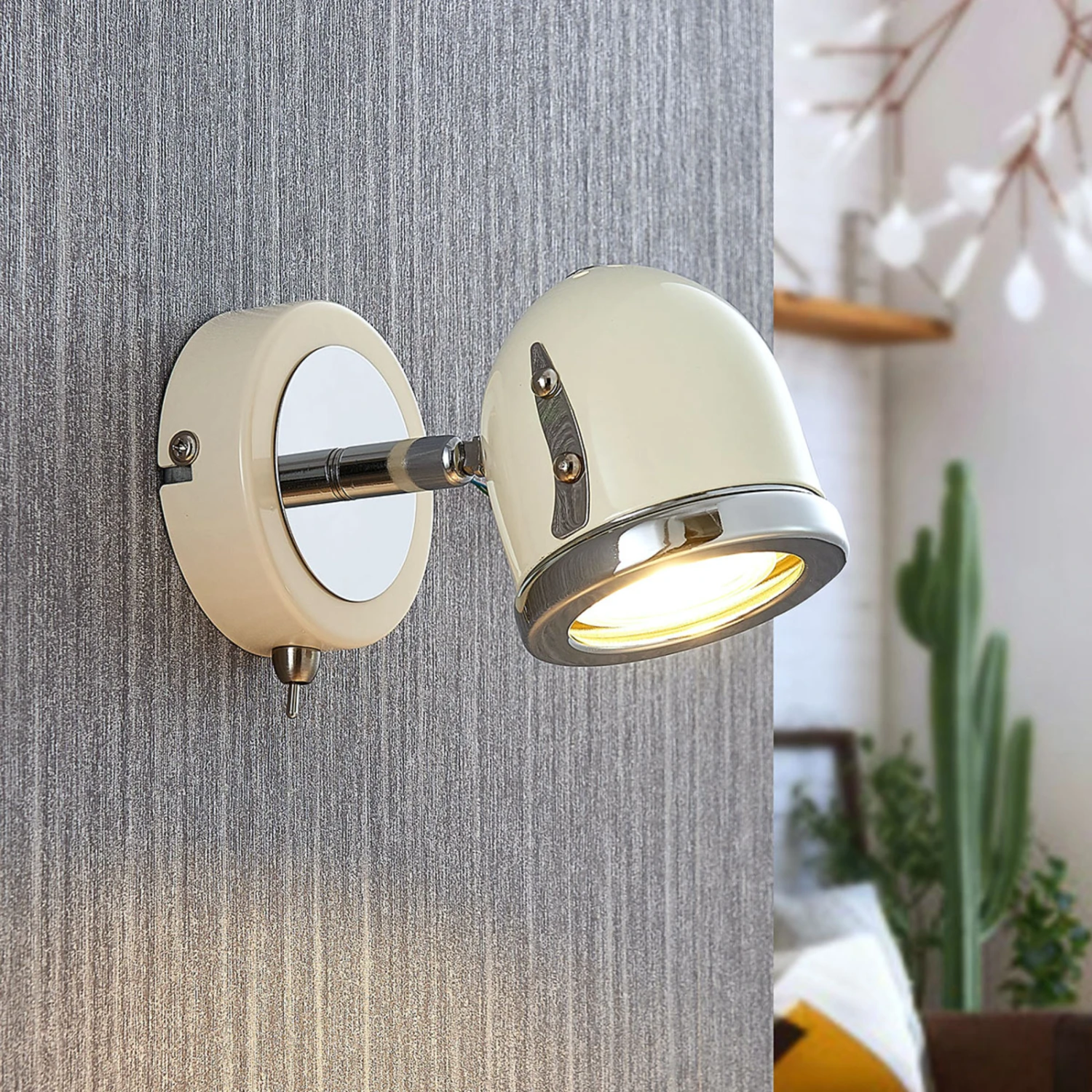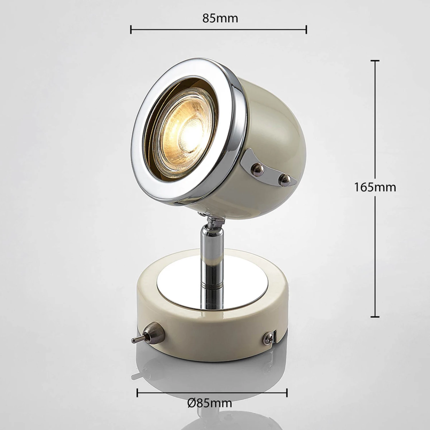 Er erinnert auf den ersten Blick an vergangene Zeiten: Die moderne und stylische Wandleuchte Jakov ist in einem hübschen Creme-Ton ausgestattet, welcher geschickt mit chromfarbenen Details kombiniert wird. Der Spot selbst wird mit GU10-Leuchtmitteln bestückt und beleuchtet zielgerichtet beispielsweise die Leseecke im Wohnzimmer aus. Ein komfortabler Kippschalter seitlich ermöglicht ein bequemes Ein- und Ausschalten. Dazu kann der Leuchtenkopf bequem vor- und zurückgeschwenkt werden, um für optimales Licht zu sorgen. Eine Installation an der Decke ist ebenfalls möglich.